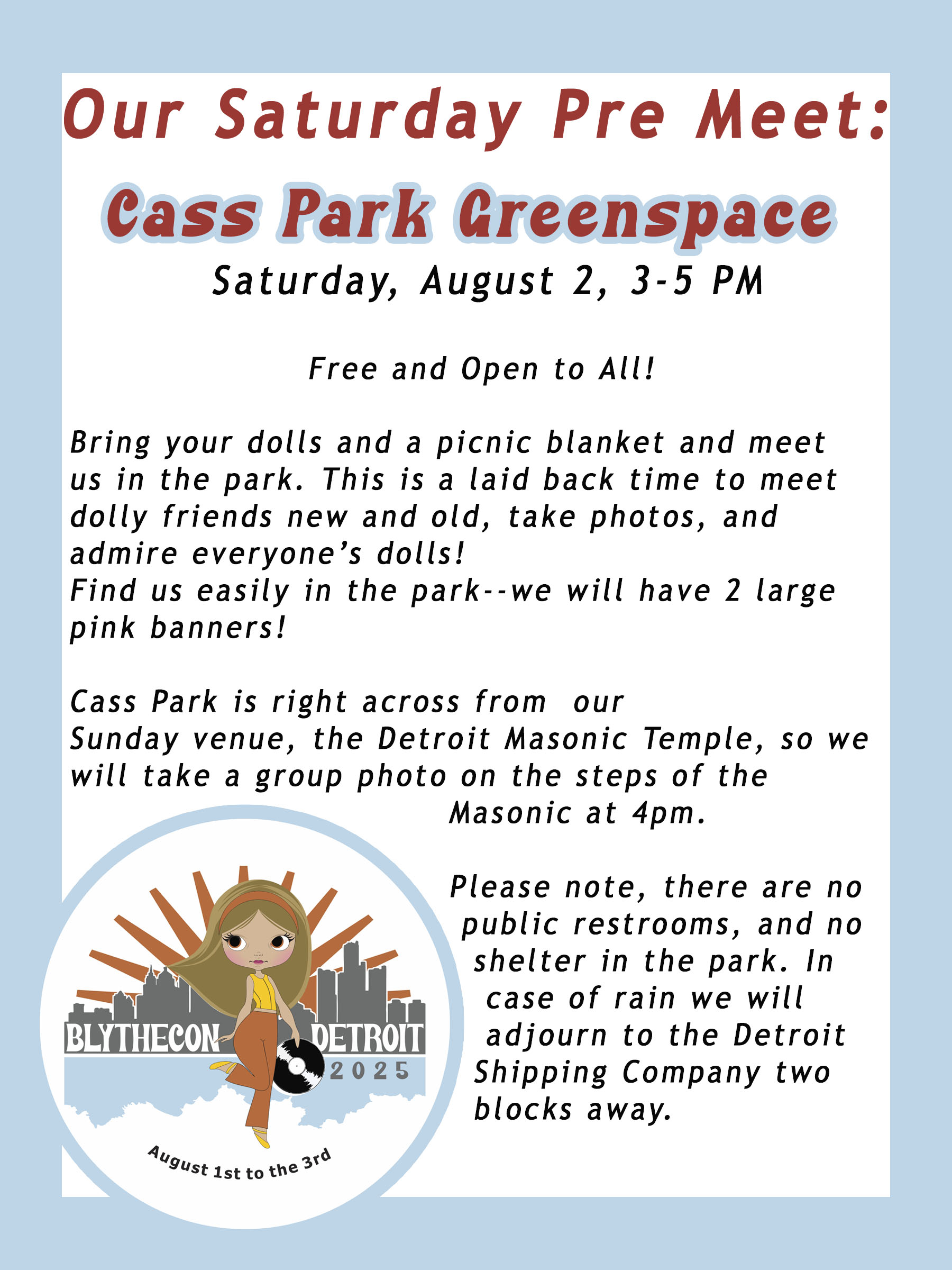 James, Kelly and I are excited to be your Blythecon Detroit 2025 hosts! Our event will be held at the beautiful Detroit Masonic Temple on Sunday, August 3, 2025, with additional meet ups and activities Friday August 1 and Saturday, Aug 2. Please join our facebook group and follow our instagram for updates!