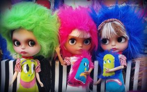 We’re getting ready to take our circus punks to the art show at the Old Miami this Saturday. Meanwhile, I’ve got carnival punk sets for Blythe dolls to join in on the fun! Each set includes a OOAK hand painted dress, a faux fur helmet, and a mini dolly size punk. They’re available now in the shop!