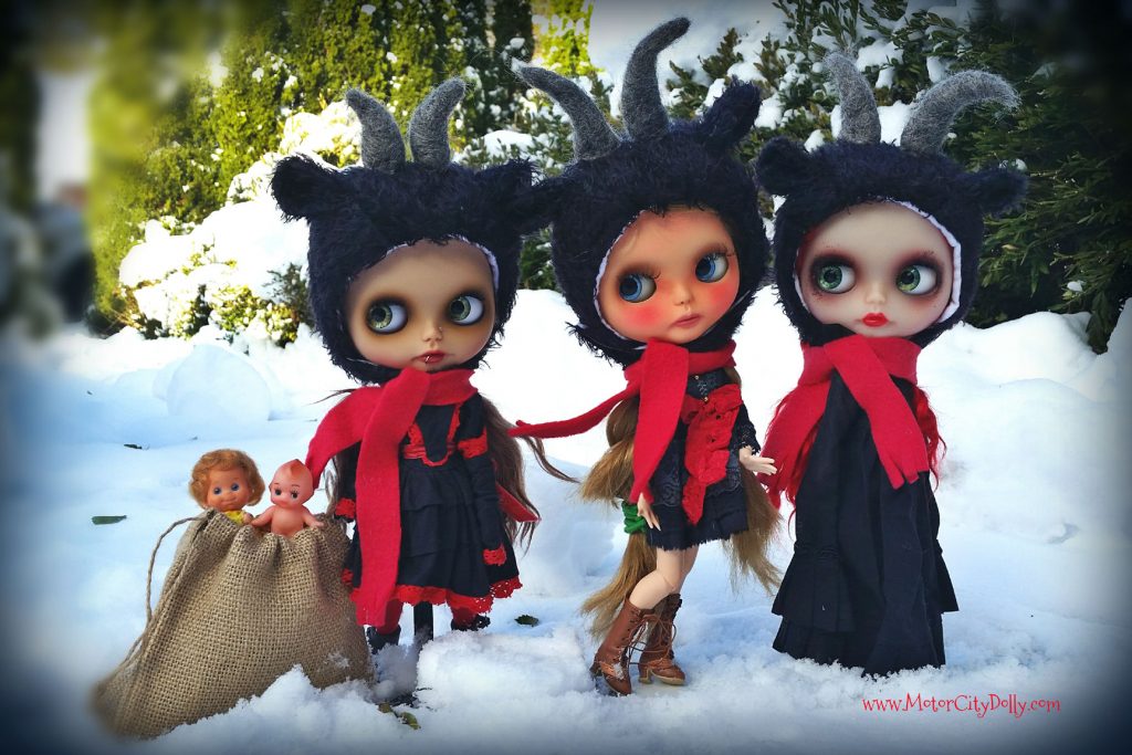 Krampus is coming for all your naughty dollies! I’ve made three little mohair krampus helmets with needle felted horns. Each comes with a red scarf reminiscent of the Christmas demon’s long red tongue.