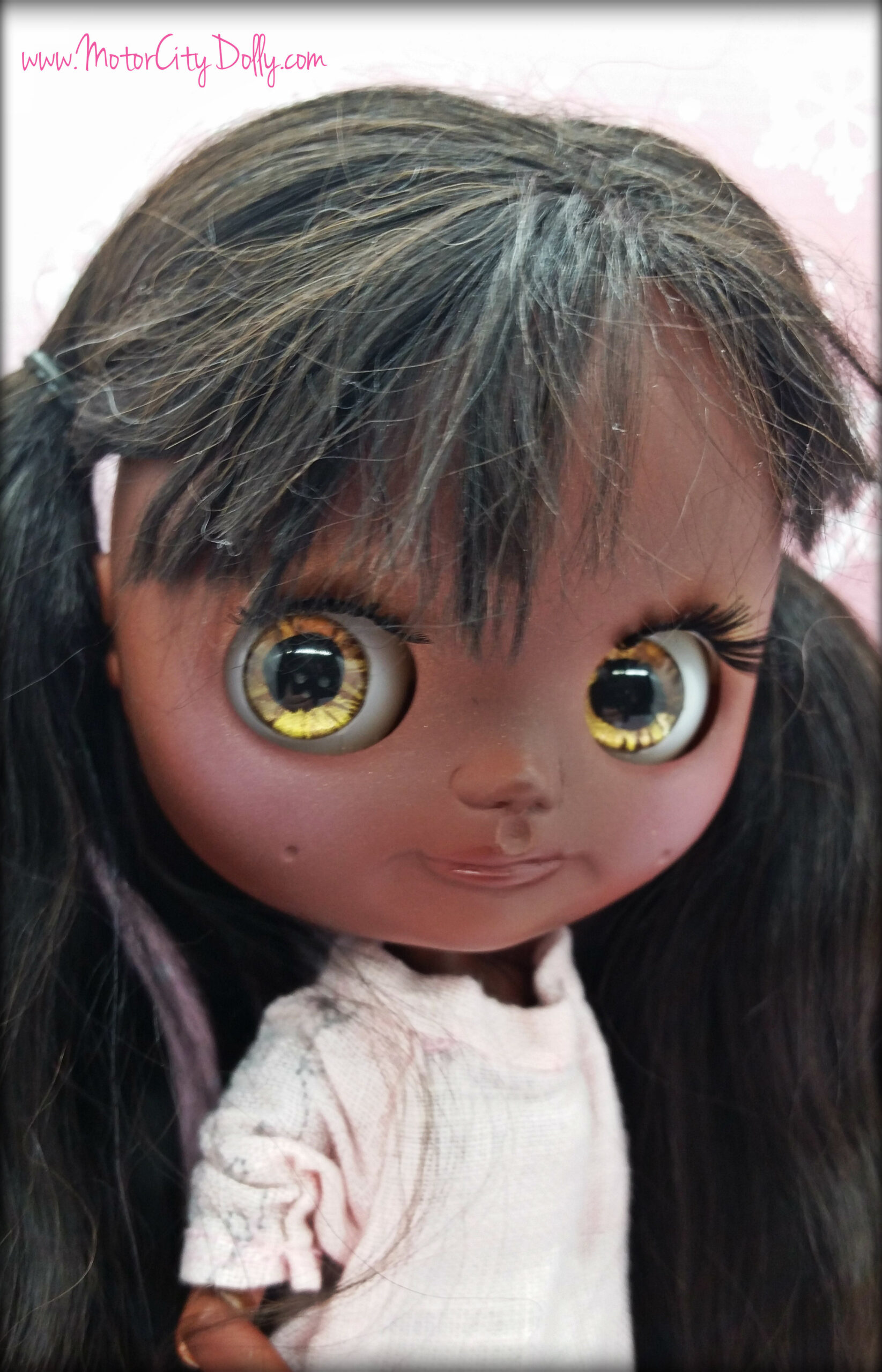 Alisha is my 82nd custom. She is on a factory Middie base with a poseable jointed body, and I’ve carved her features to give her dimples and a sweet smile. She has airbrushed chocolate brown skin, thoroughly sealed with Mister Super Clear UV cut, and hand painted glass eye chips. She has a soft, super long alpaca reroot of natural brown and black which is so much fun to style—-leave her in braids overnight for soft waves, or brush her hair and straighten it with a flat iron.