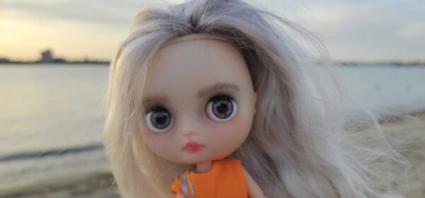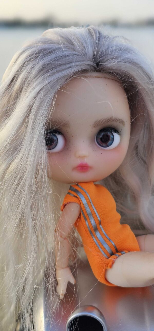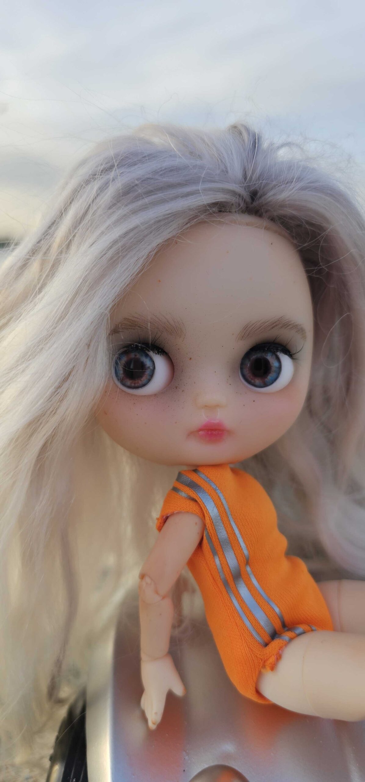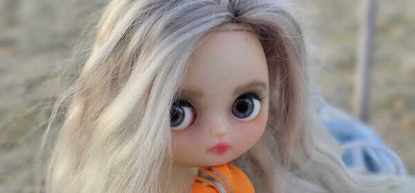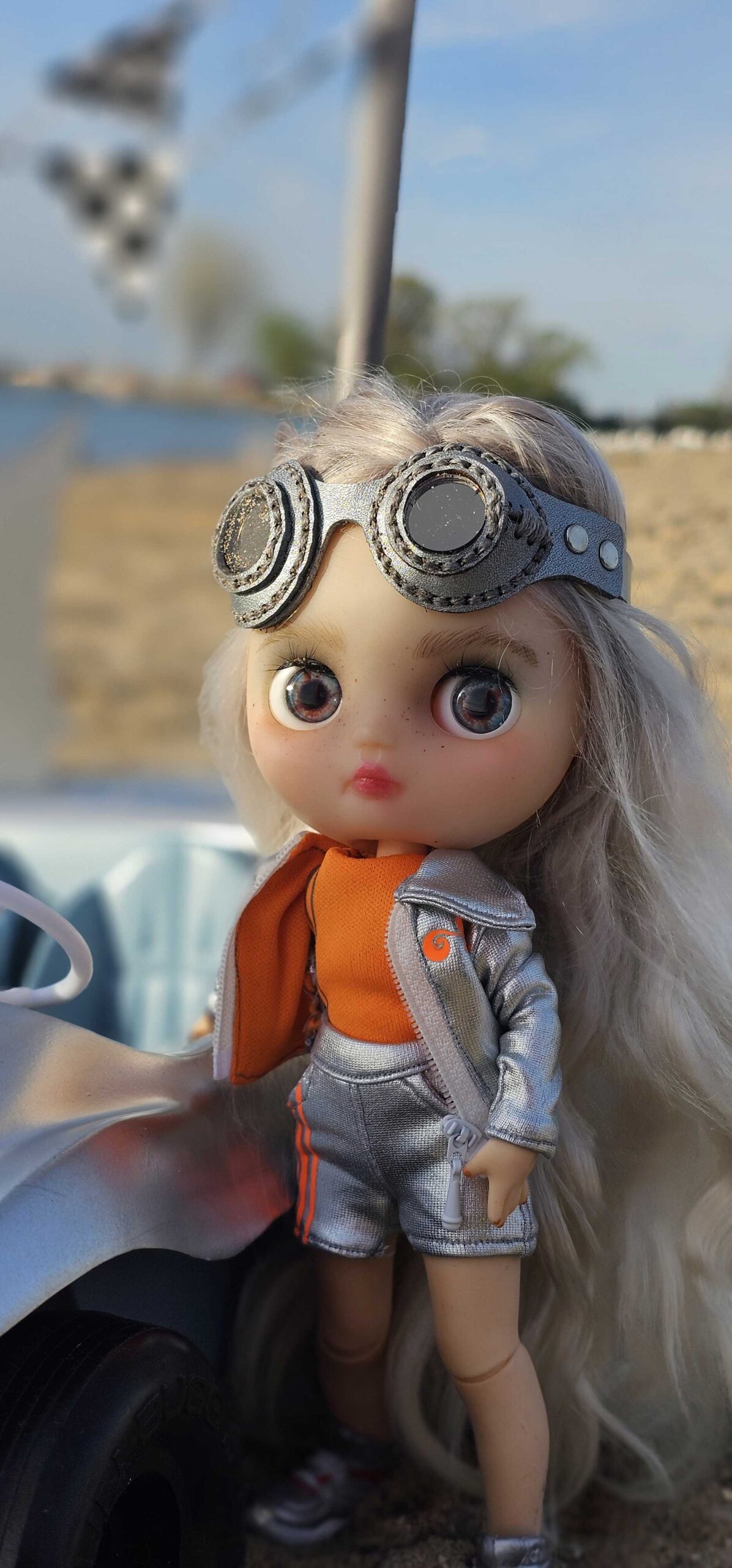 Annette is a custom Takara Pebble Cakes & Shrinking Alice Middie Blythe doll. She has translucent skin, all new carving and makeup, and a silky soft mohair reroot. She has Puppelina eye chips, is on a Monst body which allows for poseability with stability, and which is blushed and sealed. She’ll travel in her complete outfit, including swimsuit, shorts, jacket, shoes, and goggles.