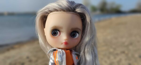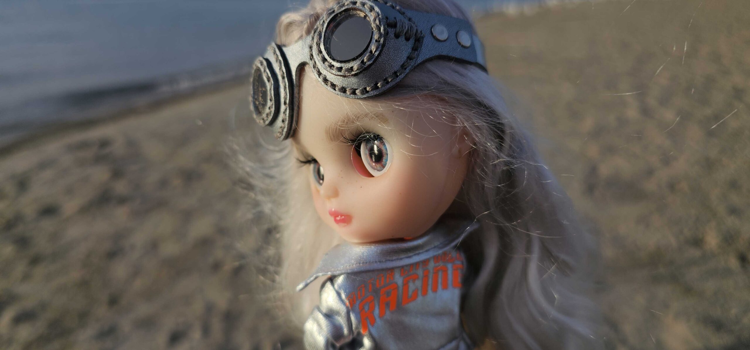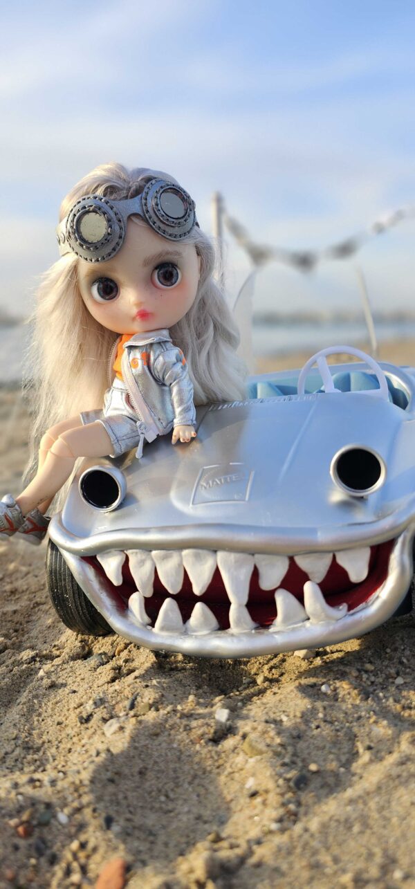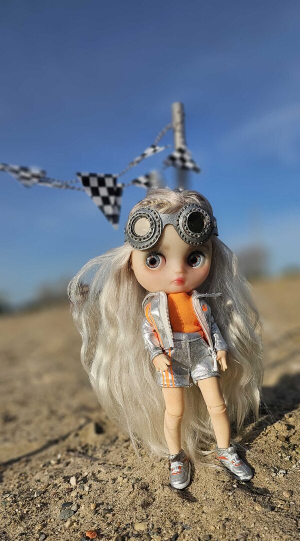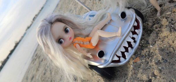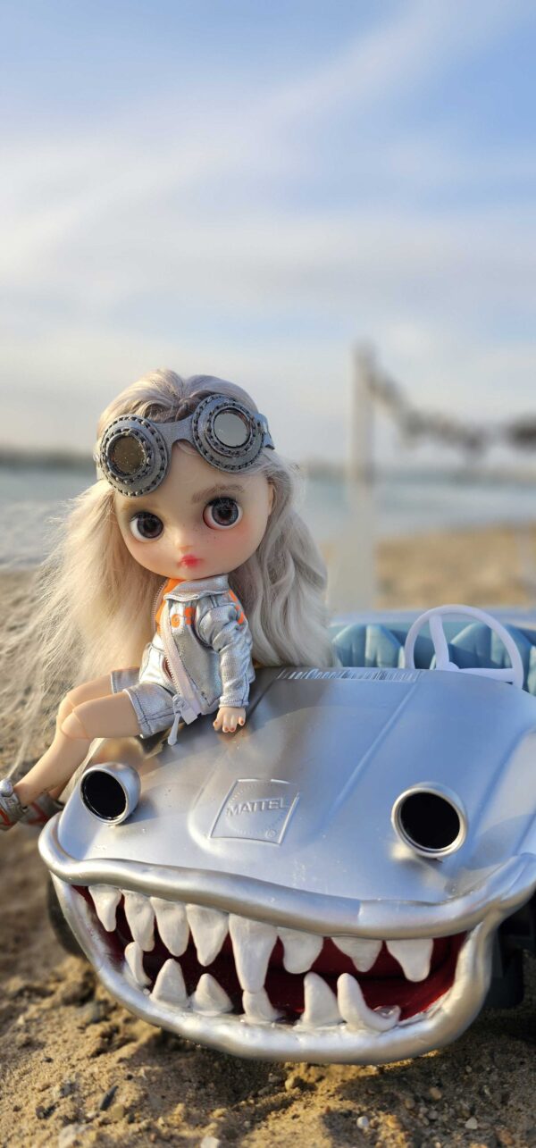 Annette is a custom Takara Pebble Cakes & Shrinking Alice Middie Blythe doll. She has translucent skin, all new carving and makeup, and a silky soft mohair reroot. She has Puppelina eye chips, is on a Monst body which allows for poseability with stability, and which is blushed and sealed. She’ll travel in her complete outfit, including swimsuit, shorts, jacket, shoes, and goggles.