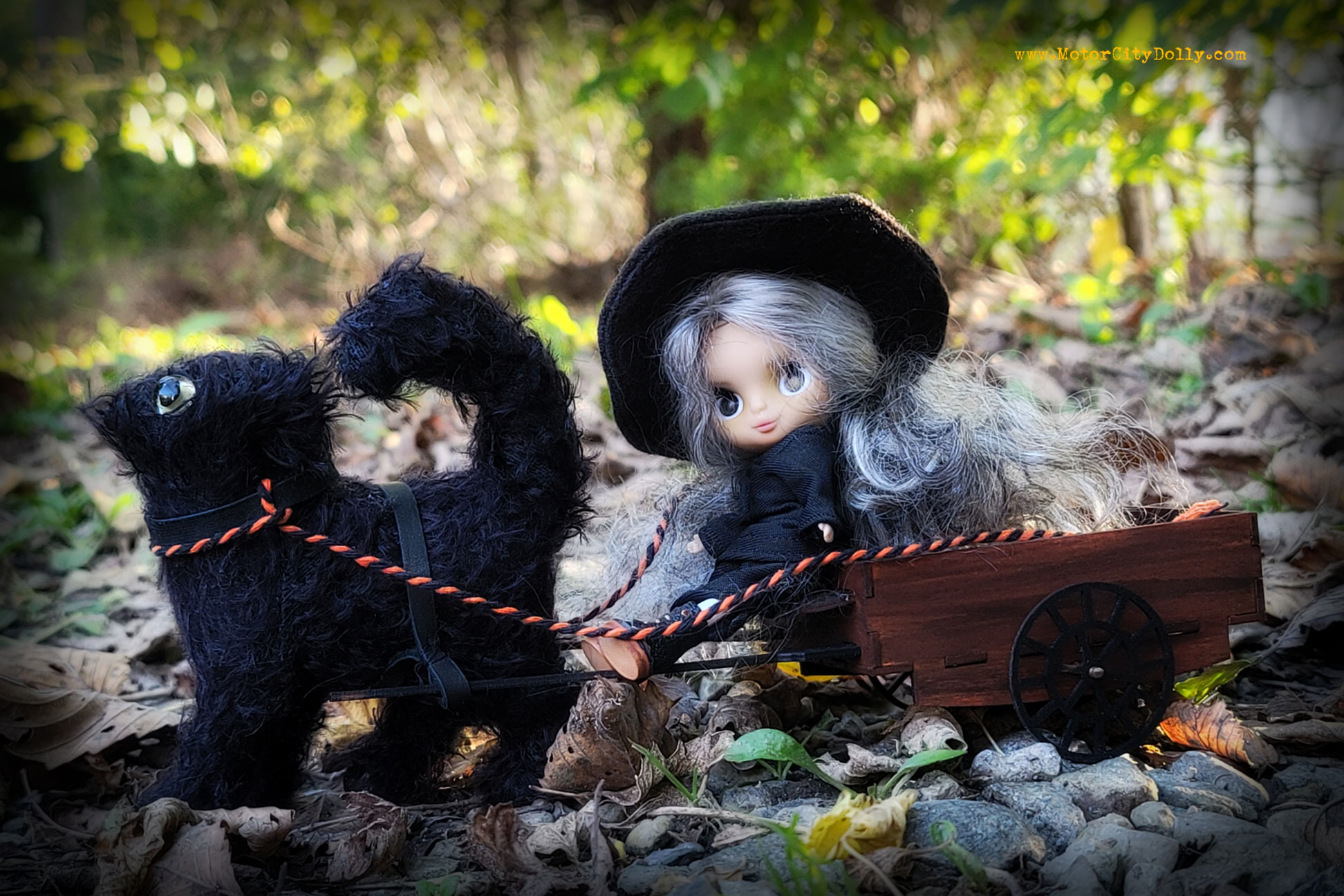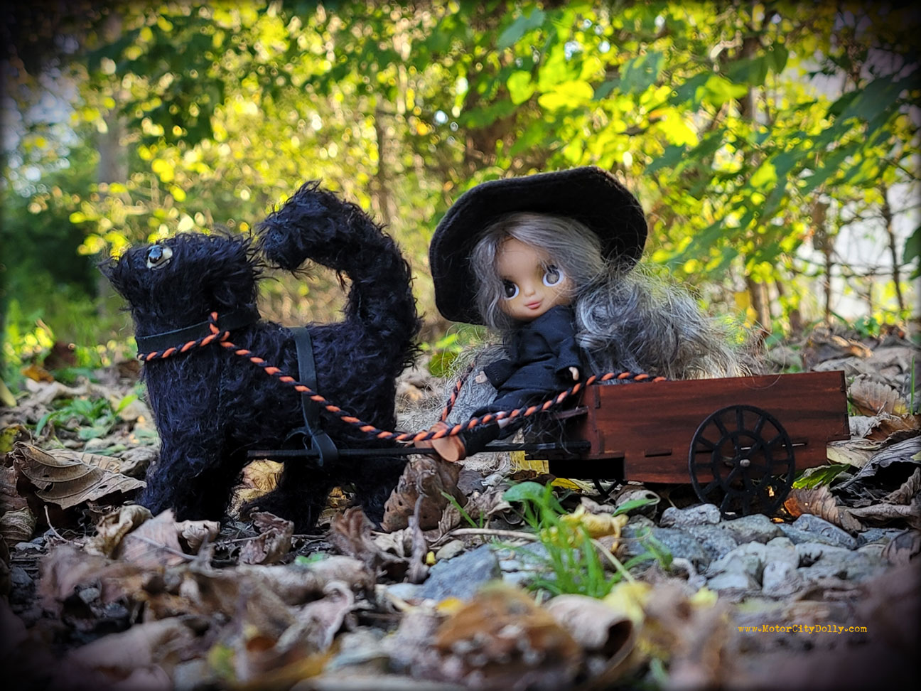 Bea comes with her little wood cart (yes it really rolls,) her handmade wool witch hat, her black dress, and the most adorable teeny leather boots from Crafty Cora Shop. Her kitty comes too to pull the cart—he is made of mohair scraps glued to a paper mache base.