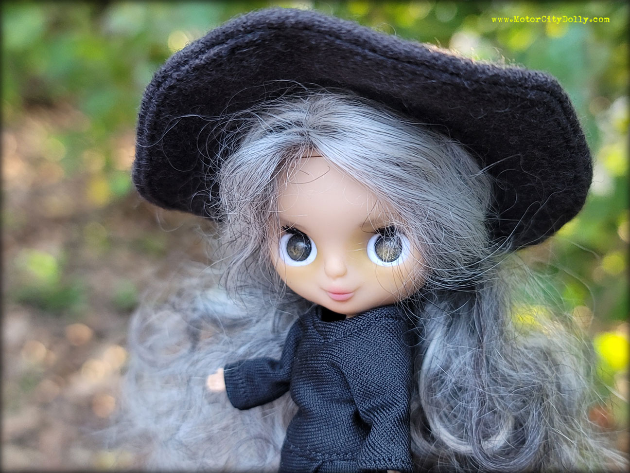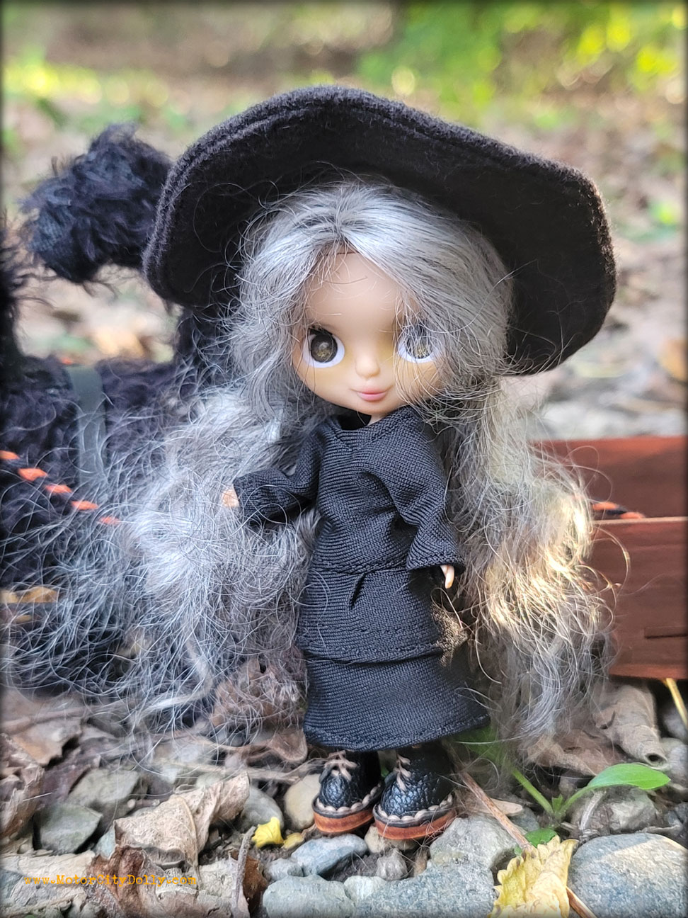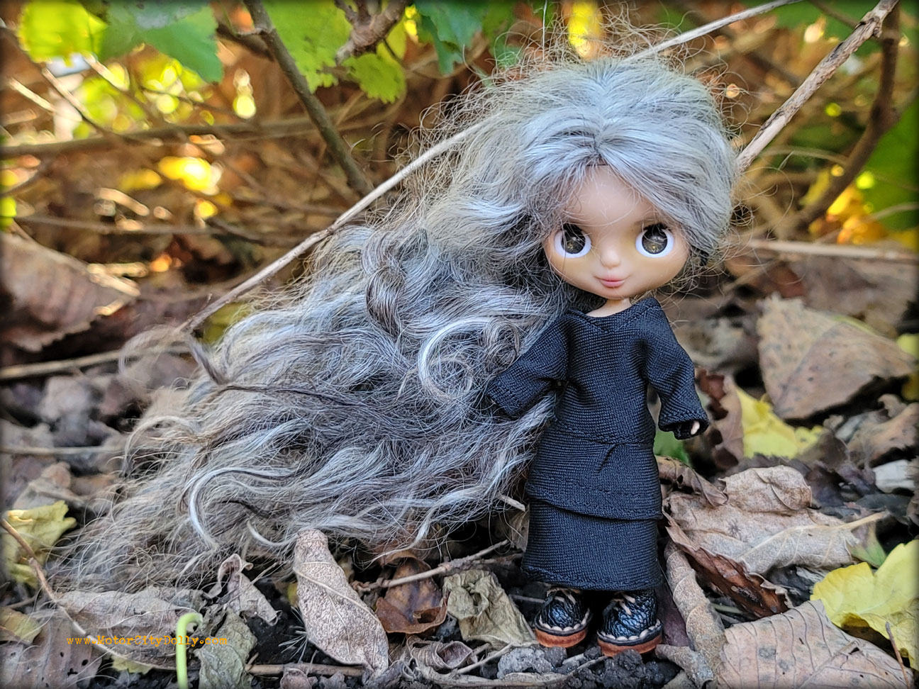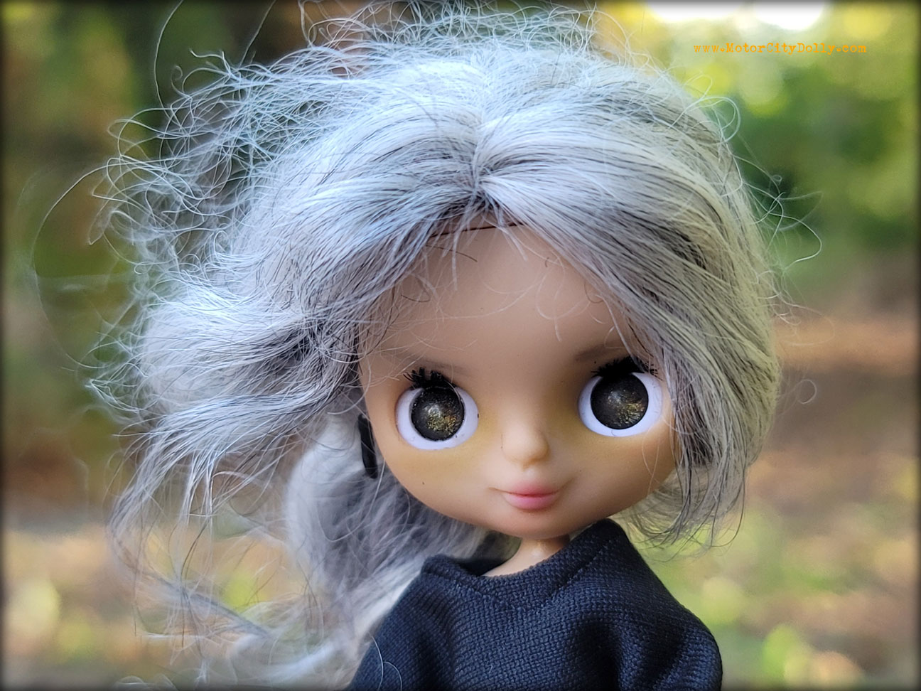 My little Bea is a Takara Petite Cinnamon Girl base that I have given all new carving, makeup, hand painted eye chips, and a long gray Gotland wool reroot (super soft and brushable.) Her face has been thoroughly sealed with MSC UV Cut.