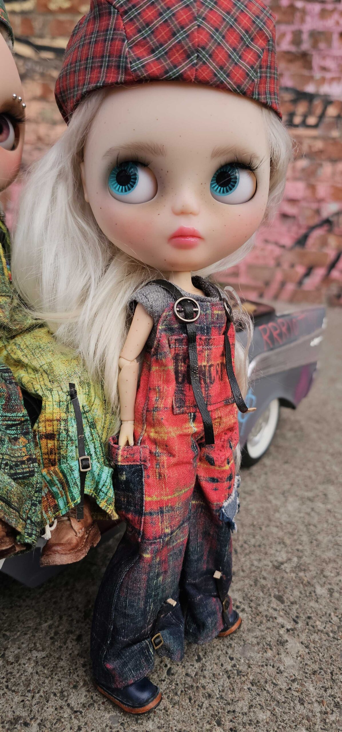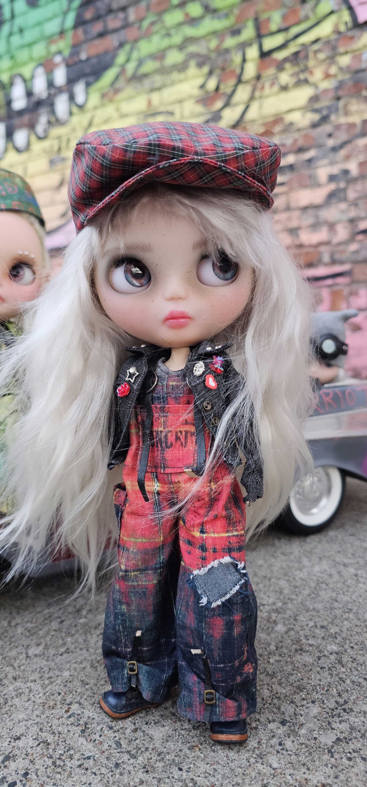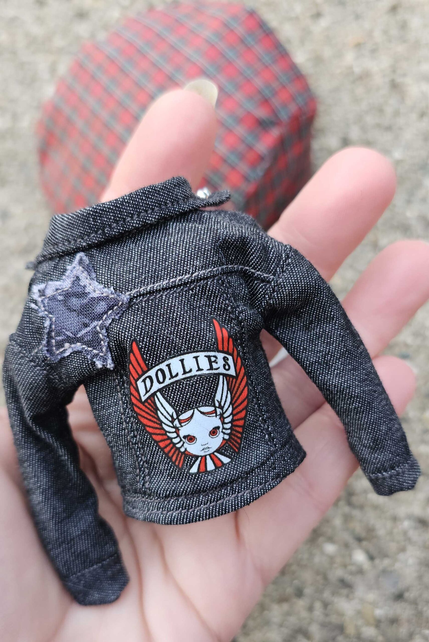 This clothing set for Blythe includes pants, T-shirt, hat, and Dollies logo jacket, all one of a kind creations for a totally unique look.