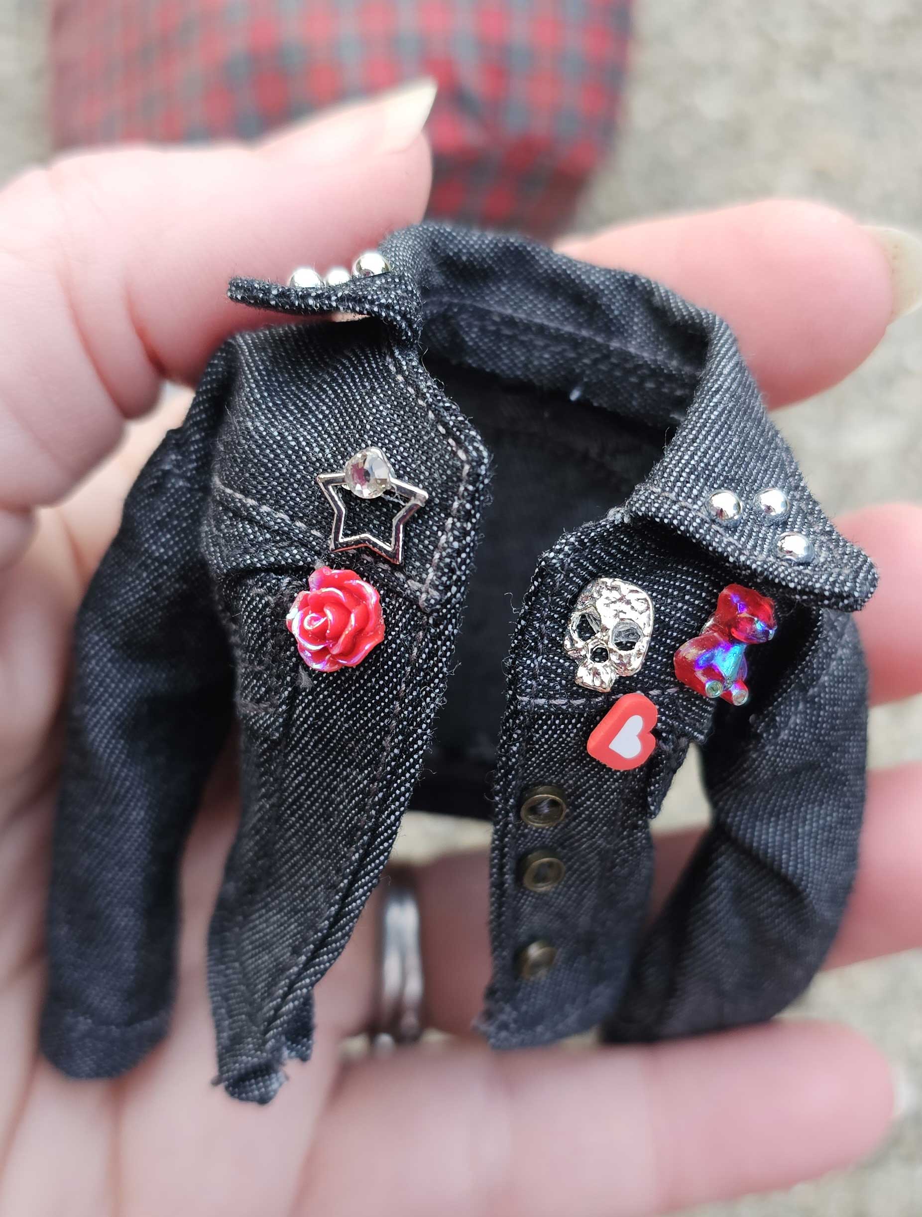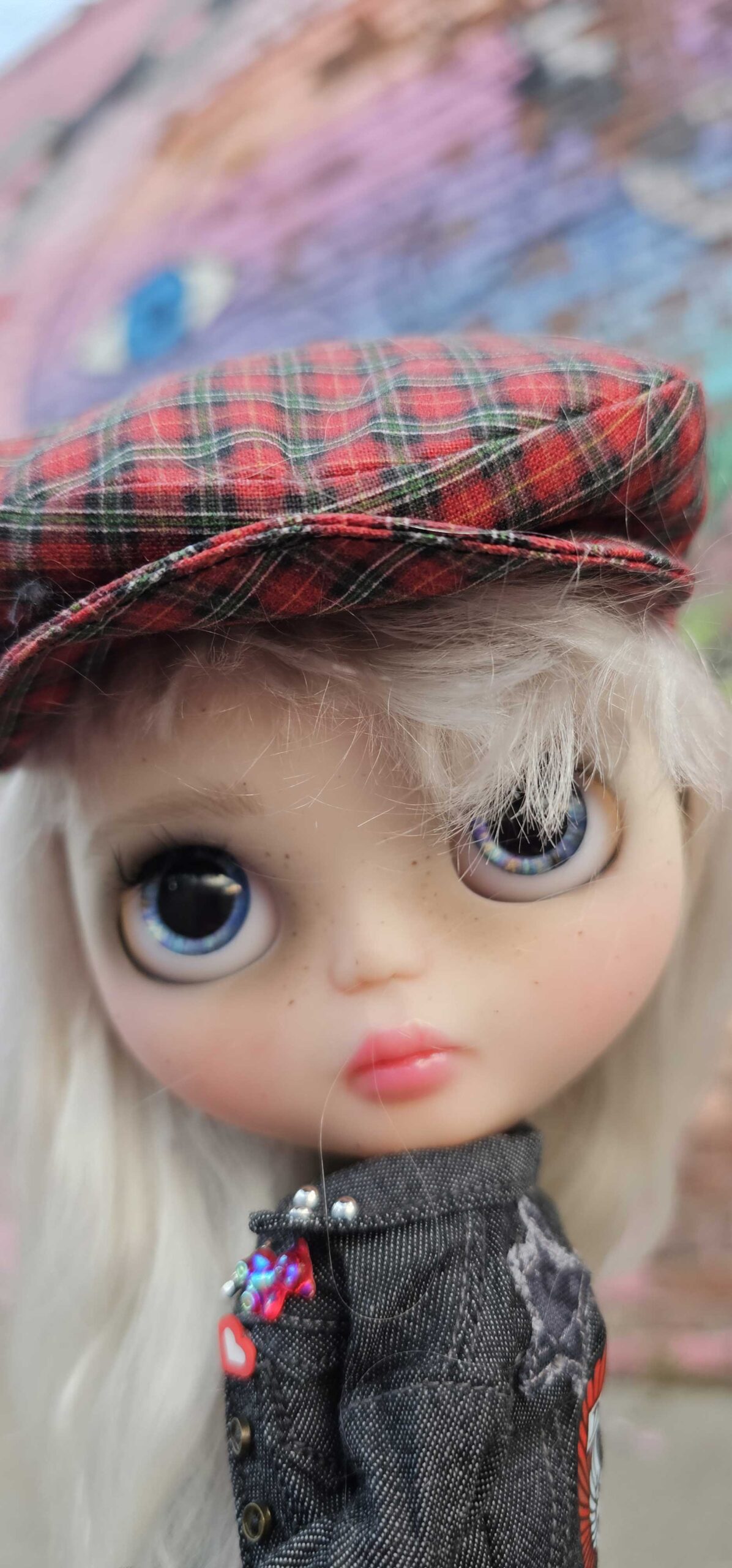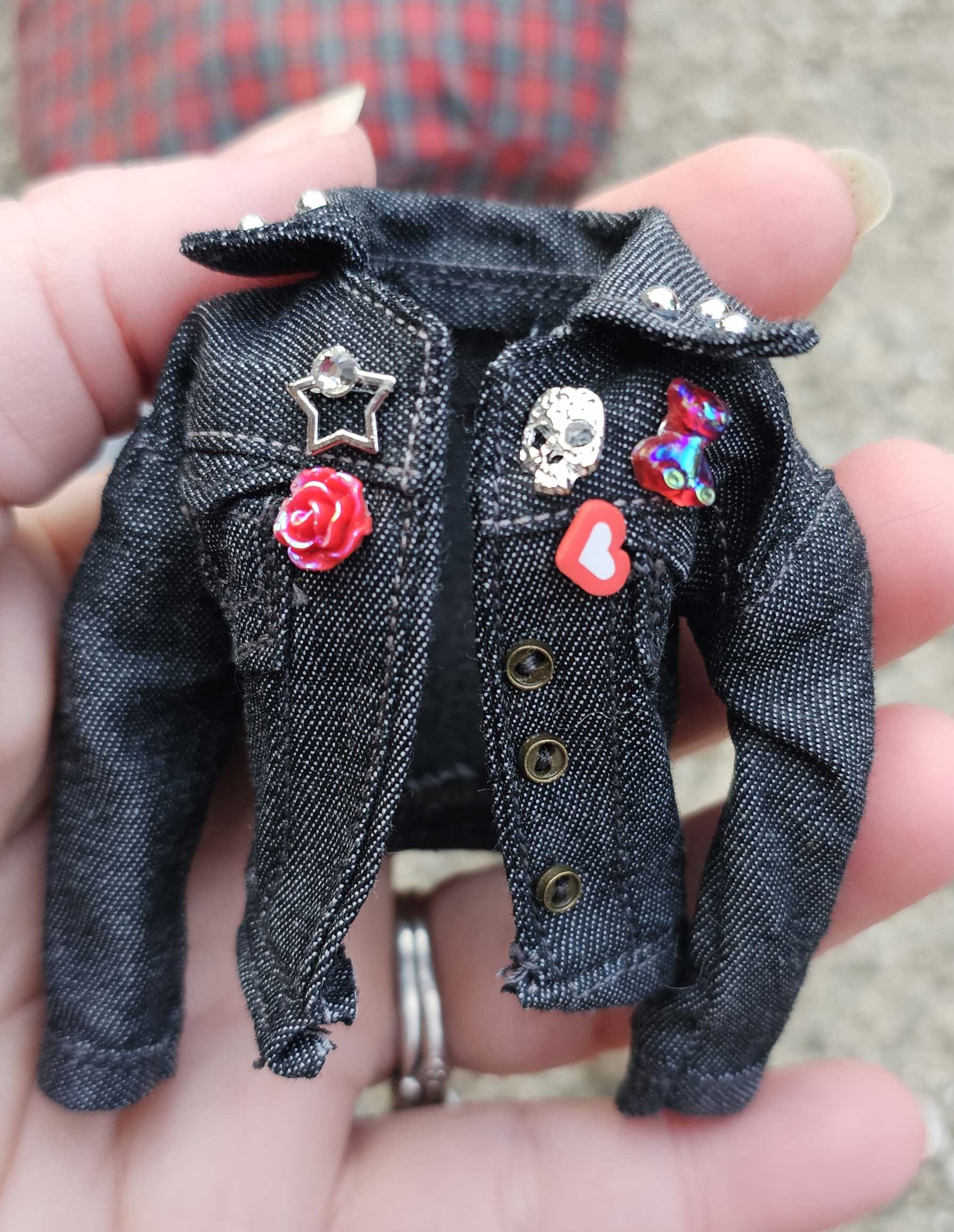 This clothing set for Blythe includes pants, T-shirt, hat, and Dollies logo jacket, all one of a kind creations for a totally unique look.