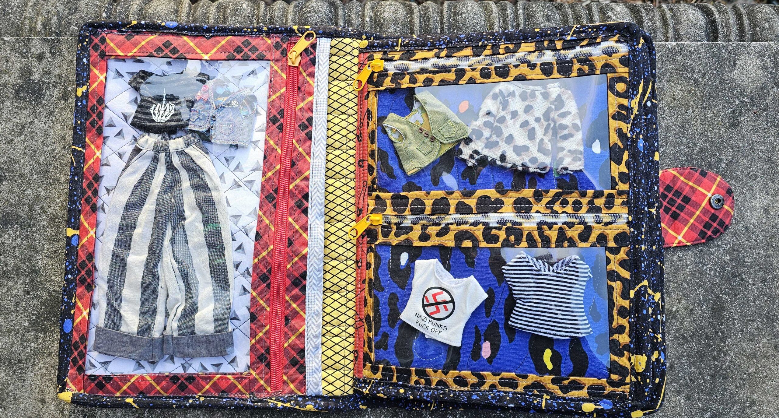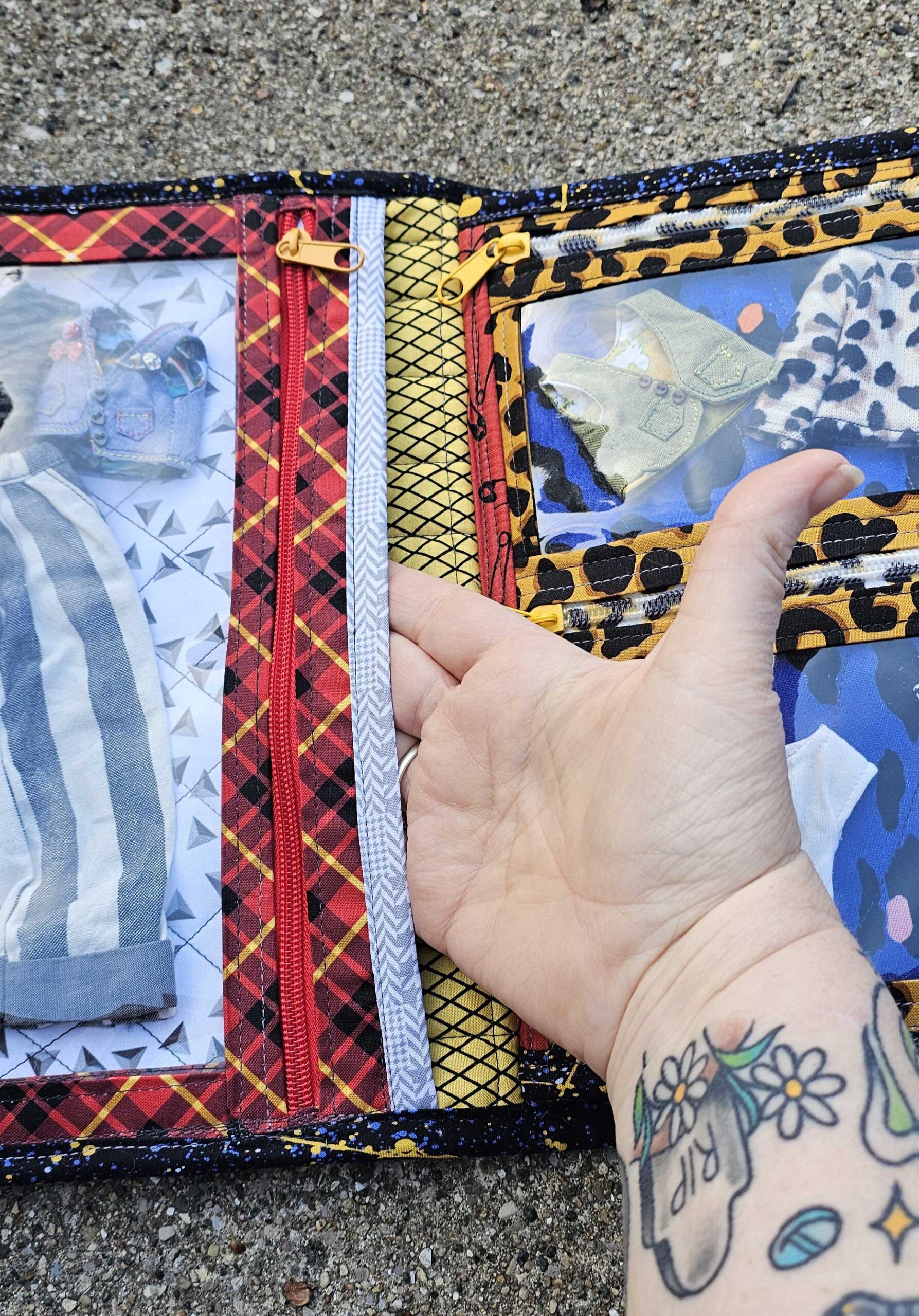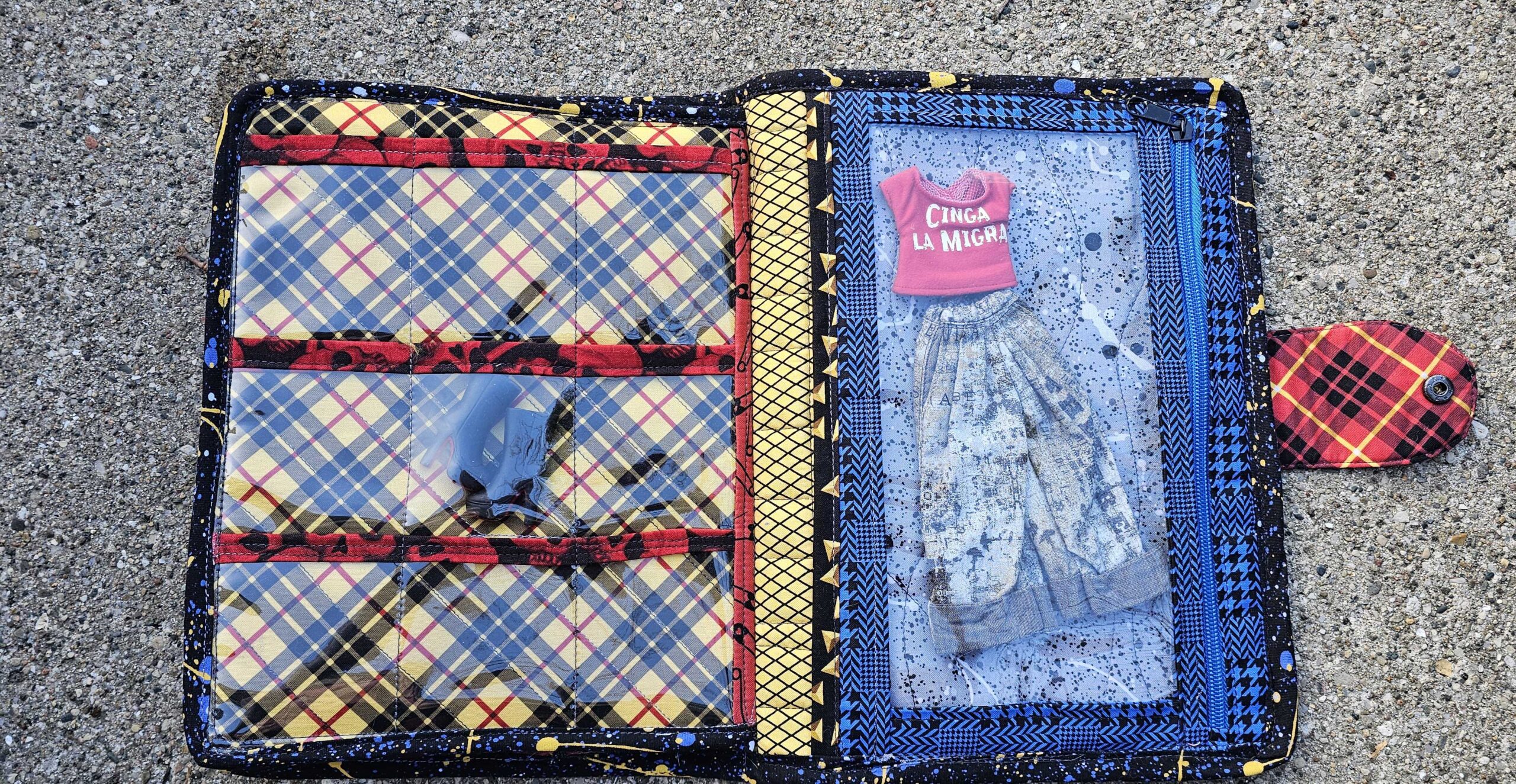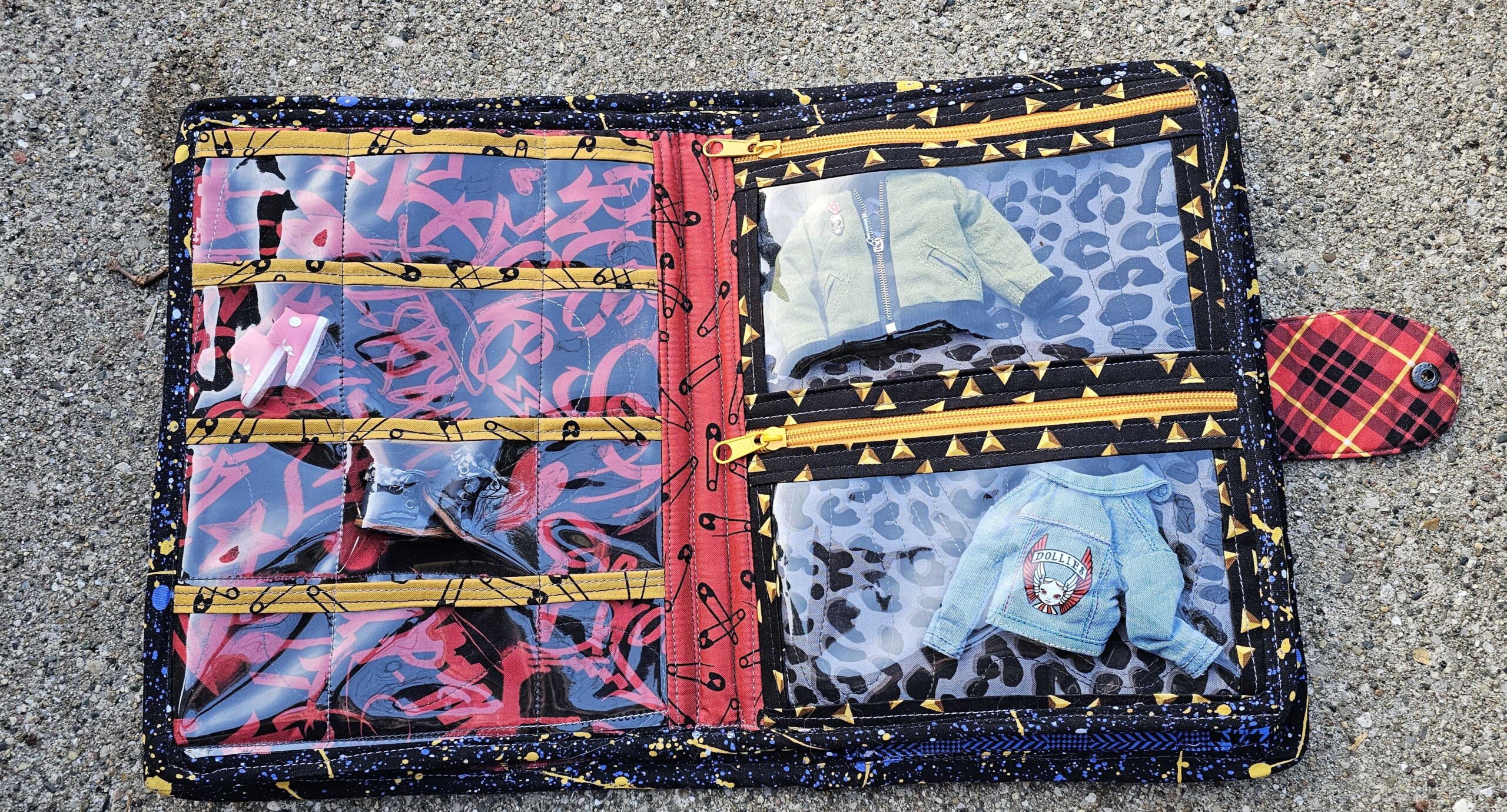 Introducing the dolly clothes trapper keeper—a quilted cotton and vinyl binder with all the pockets and zippers you need to organize your doll’s wardrobe on the road…..in style! Clothes shown are for display only.
