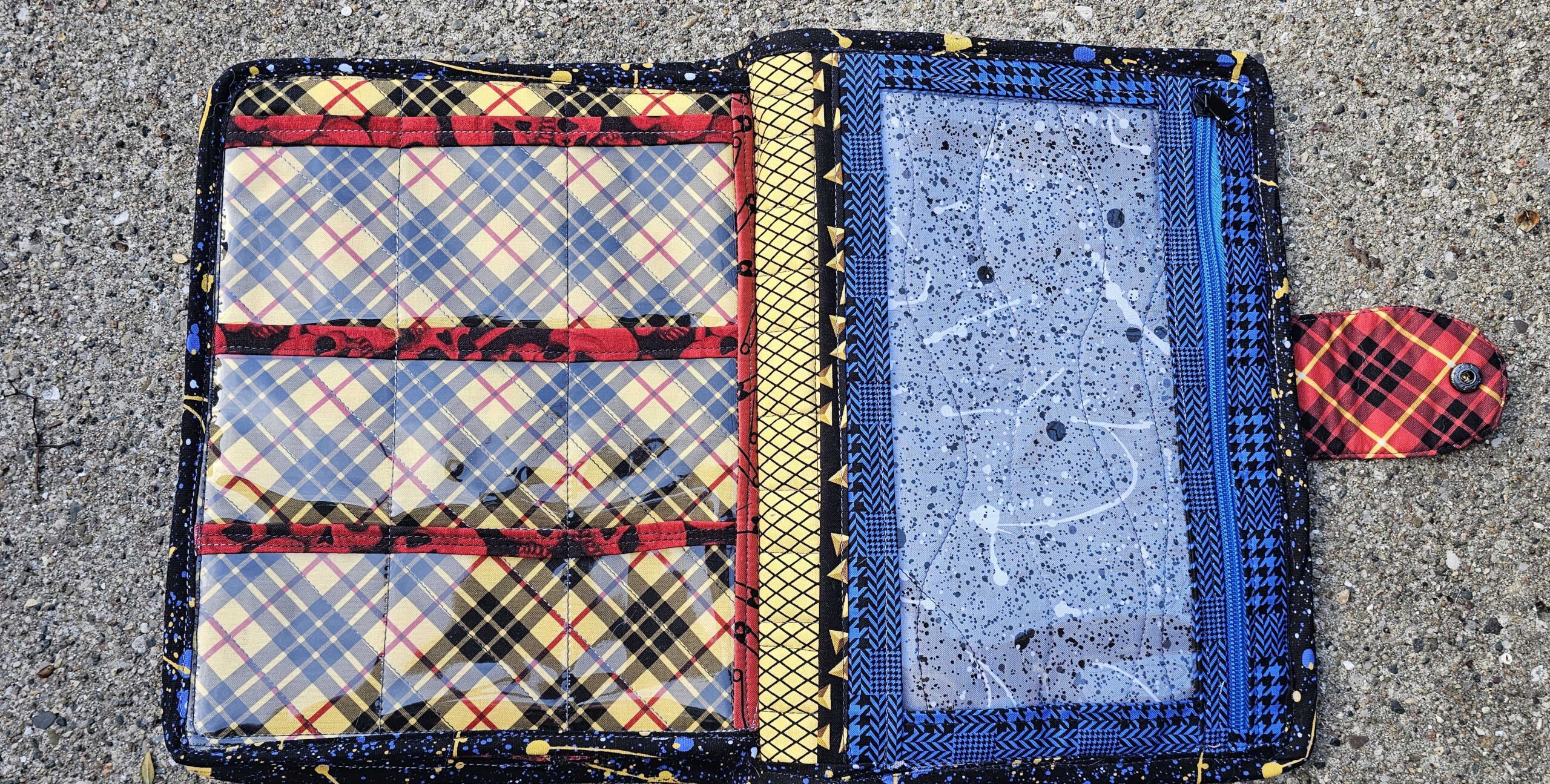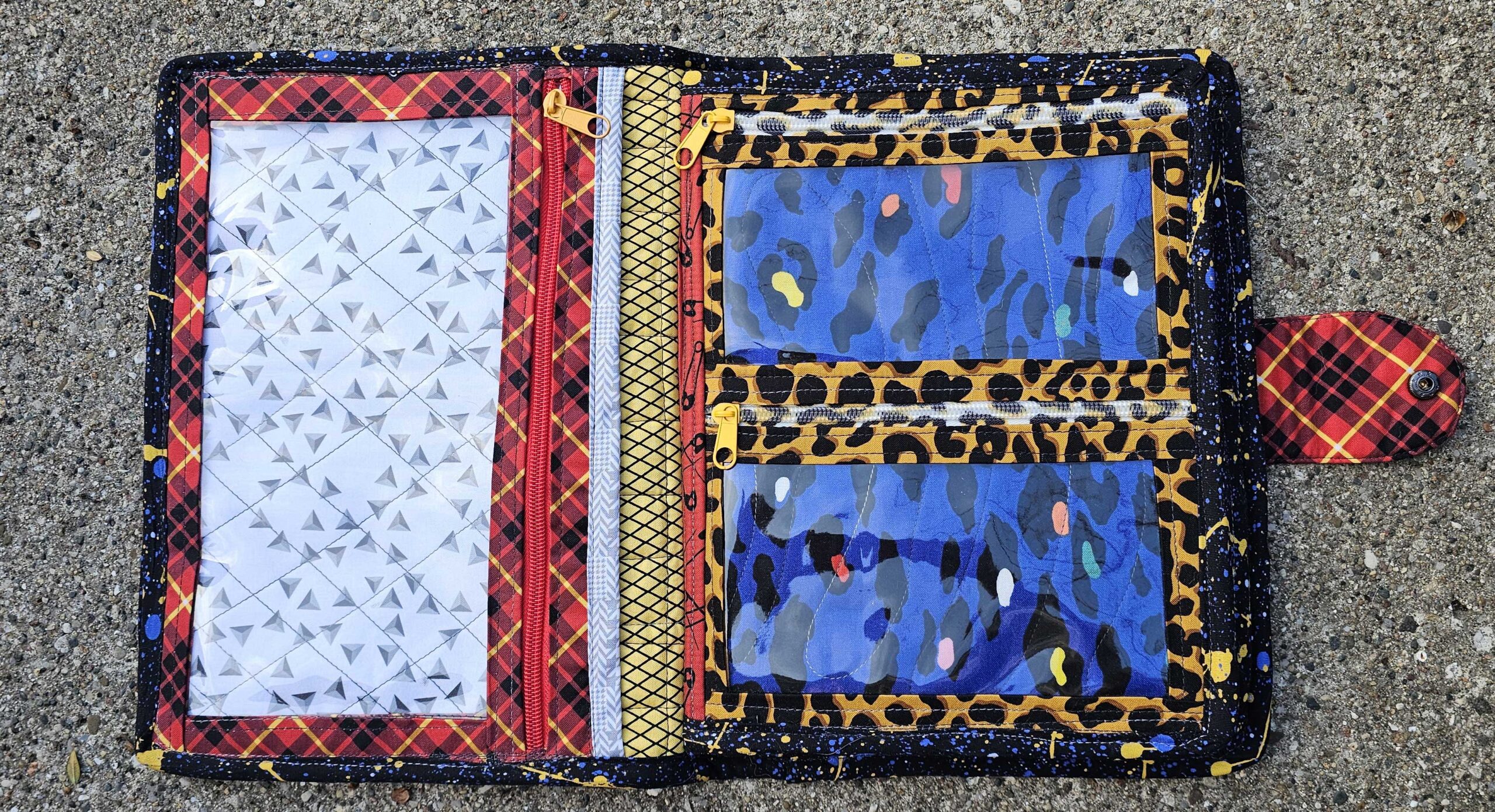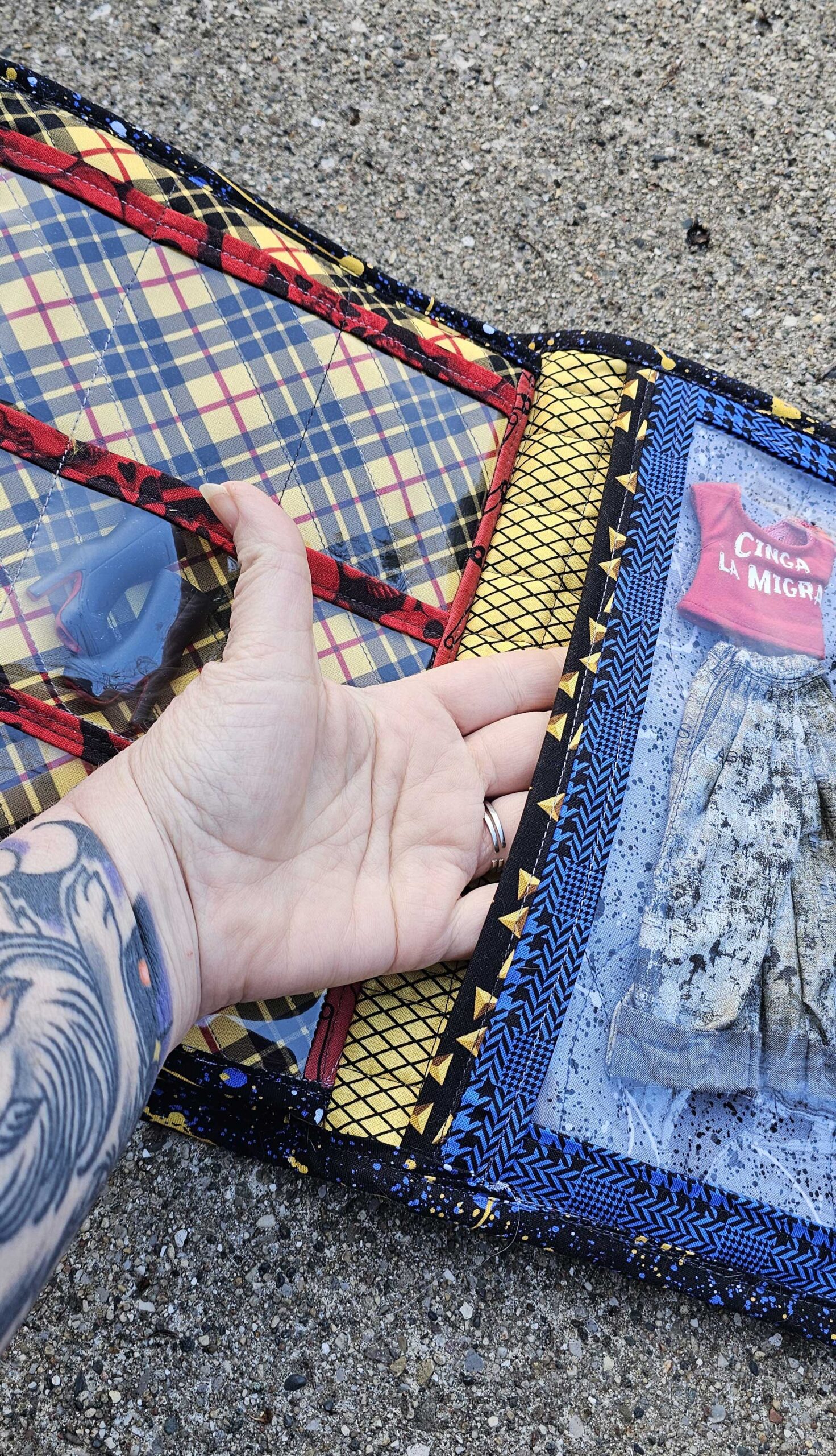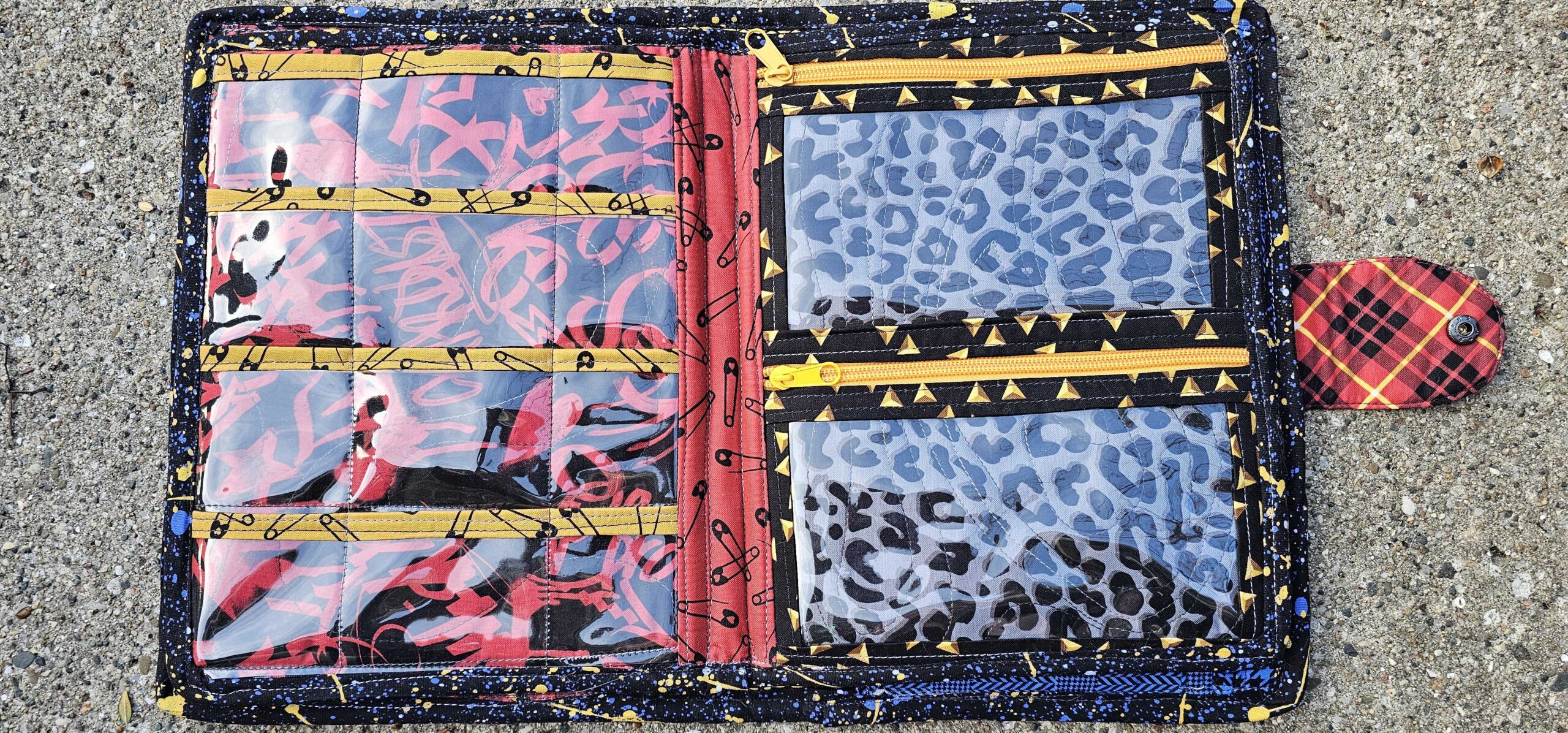 Introducing the dolly clothes trapper keeper—a quilted cotton and vinyl binder with all the pockets and zippers you need to organize your doll’s wardrobe on the road…..in style! Clothes shown are for display only.