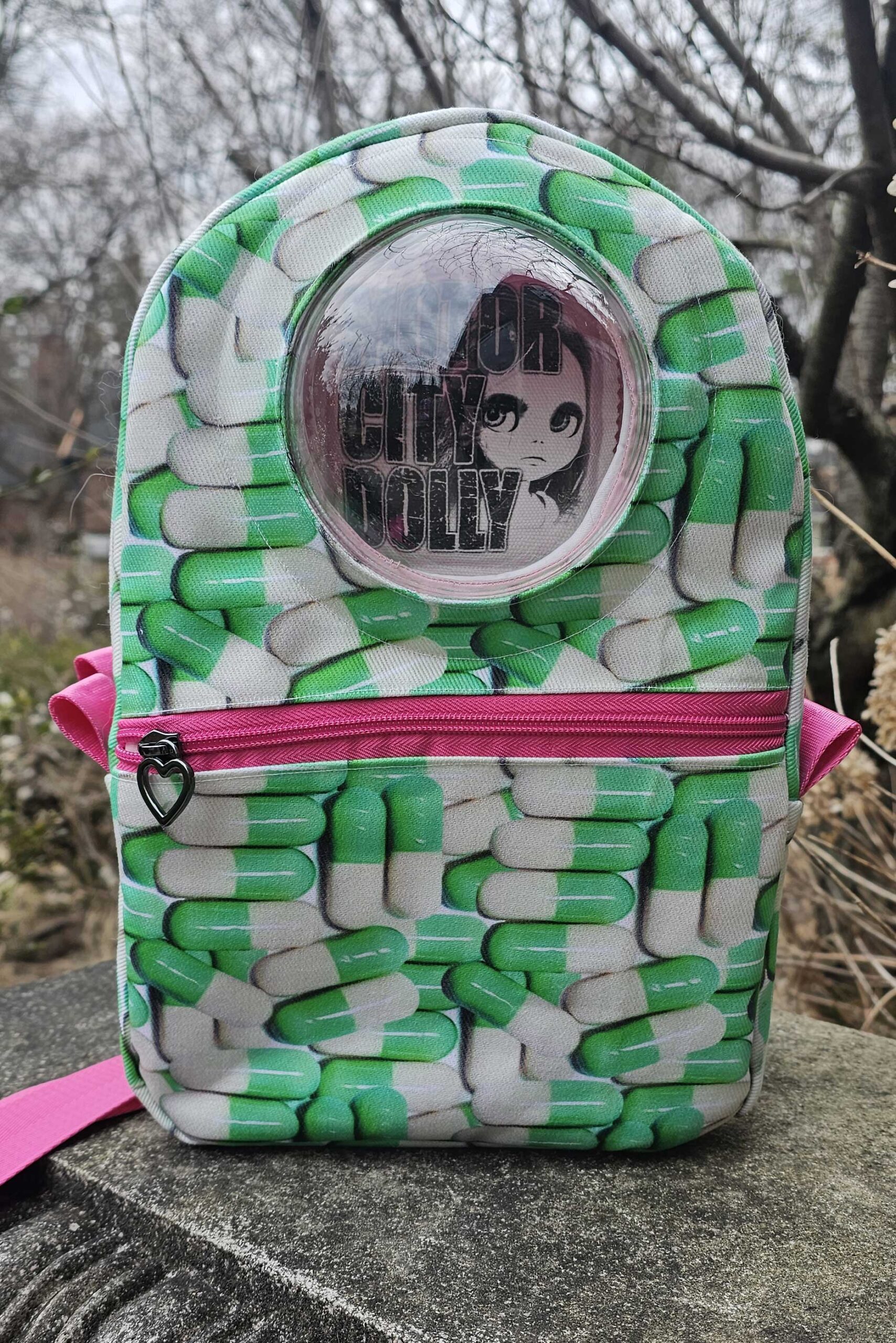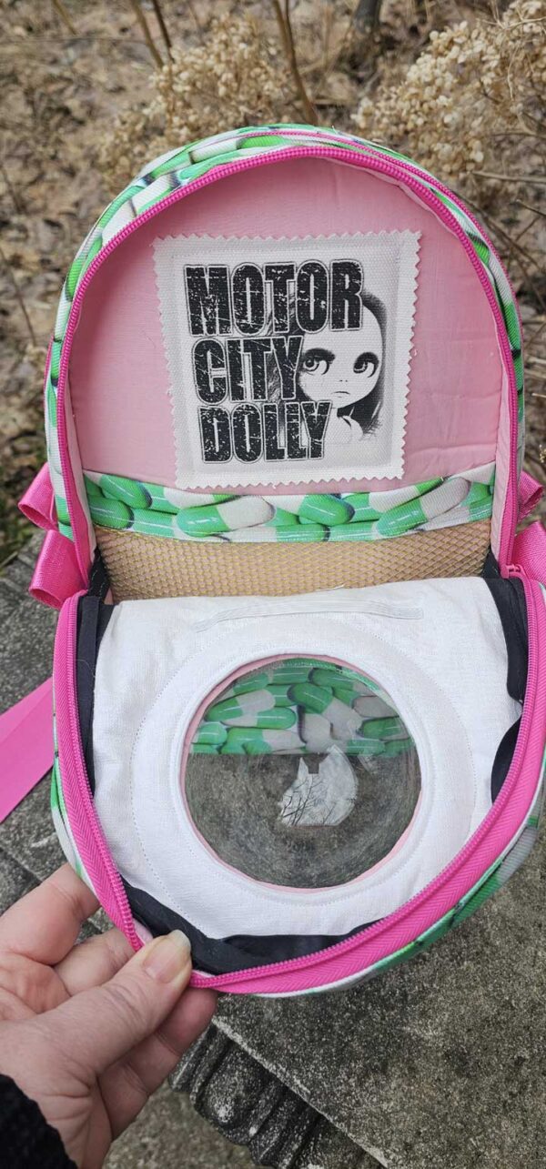 A front compartment just for Blythe and her accessories, with a padded front panel made of white linen that protects her face, and a sturdy acrylic dome for her to look out on the world. The front compartment features a net pocket to keep posing stands and extra outfits organized, as well as an elastic strap to hold Blythe in place.  There is plenty of room for a Faye, Middie or other 8″ doll to snuggle in too!
