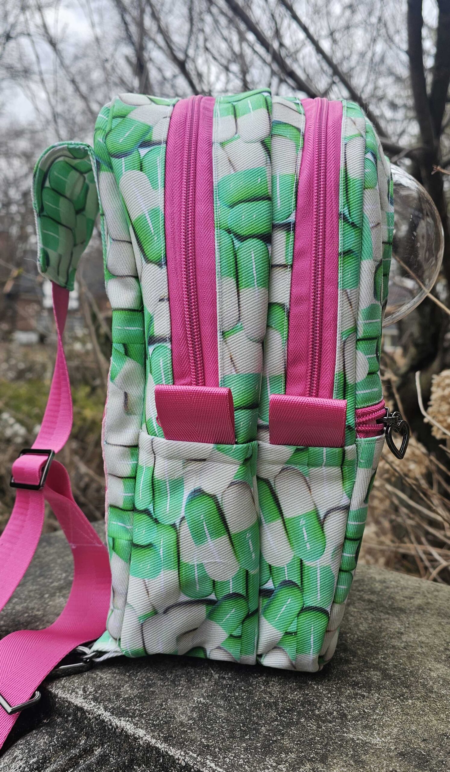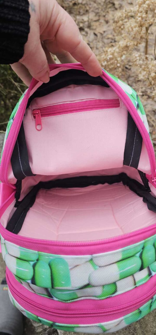 A larger second compartment that can hold as much as a wallet, a water bottle, a lightweight sweater, and a snack for you, OR a couple more Blythes! This compartment is separated from the Blythe compartment with a neoprene liner for moisture resistant padding between your stuff and your doll.