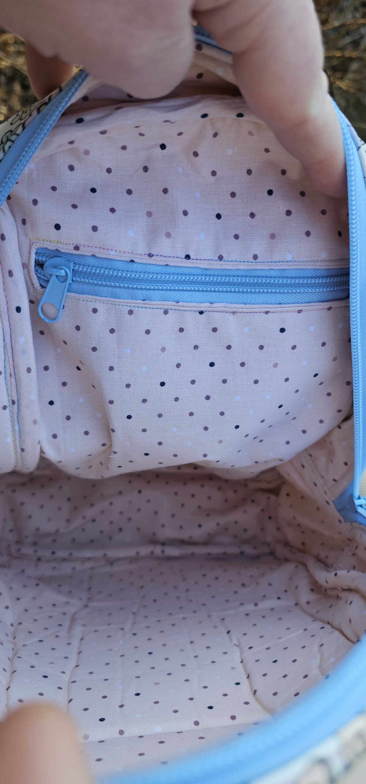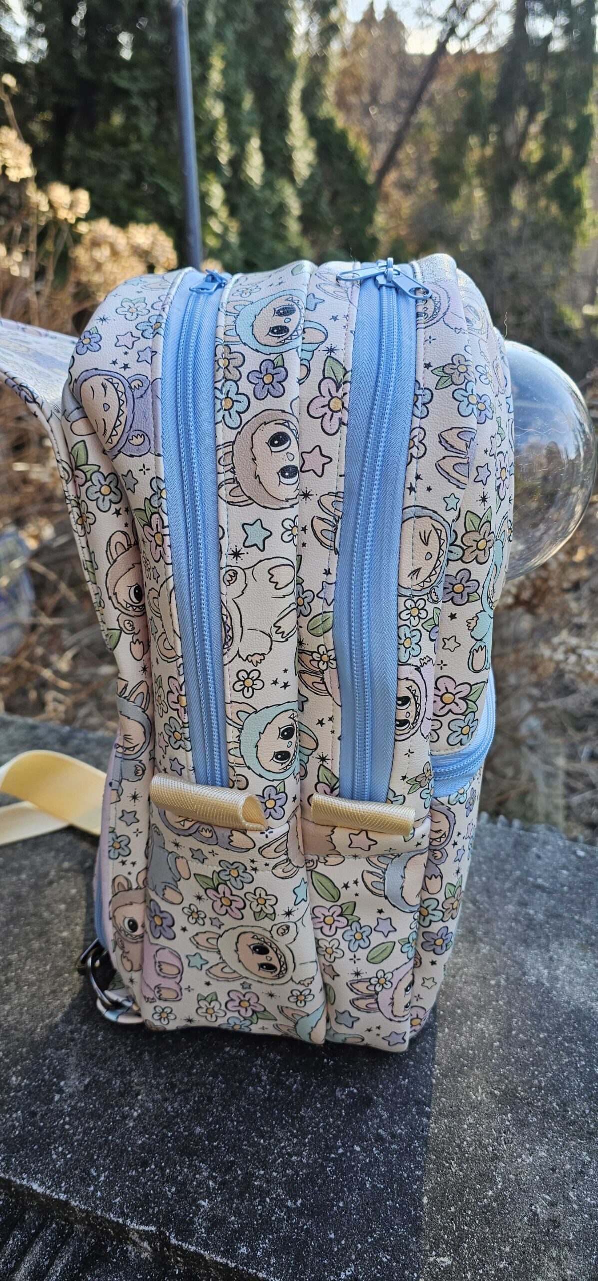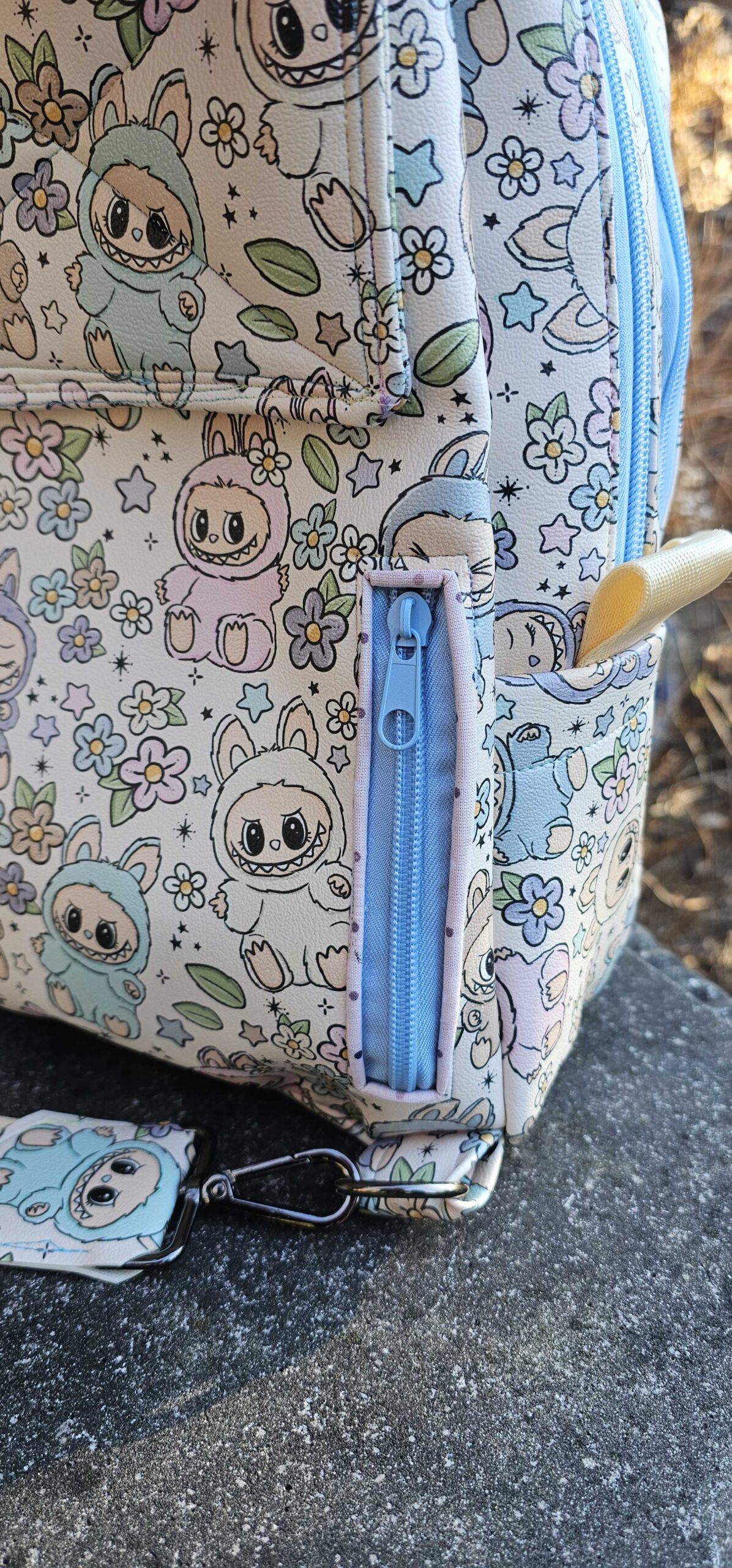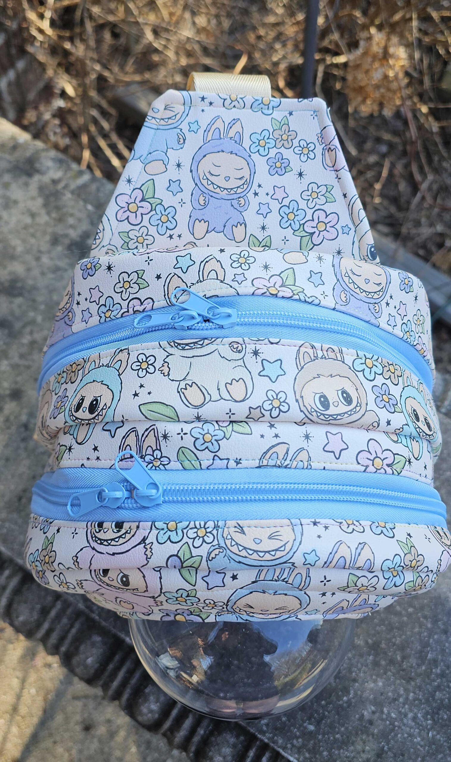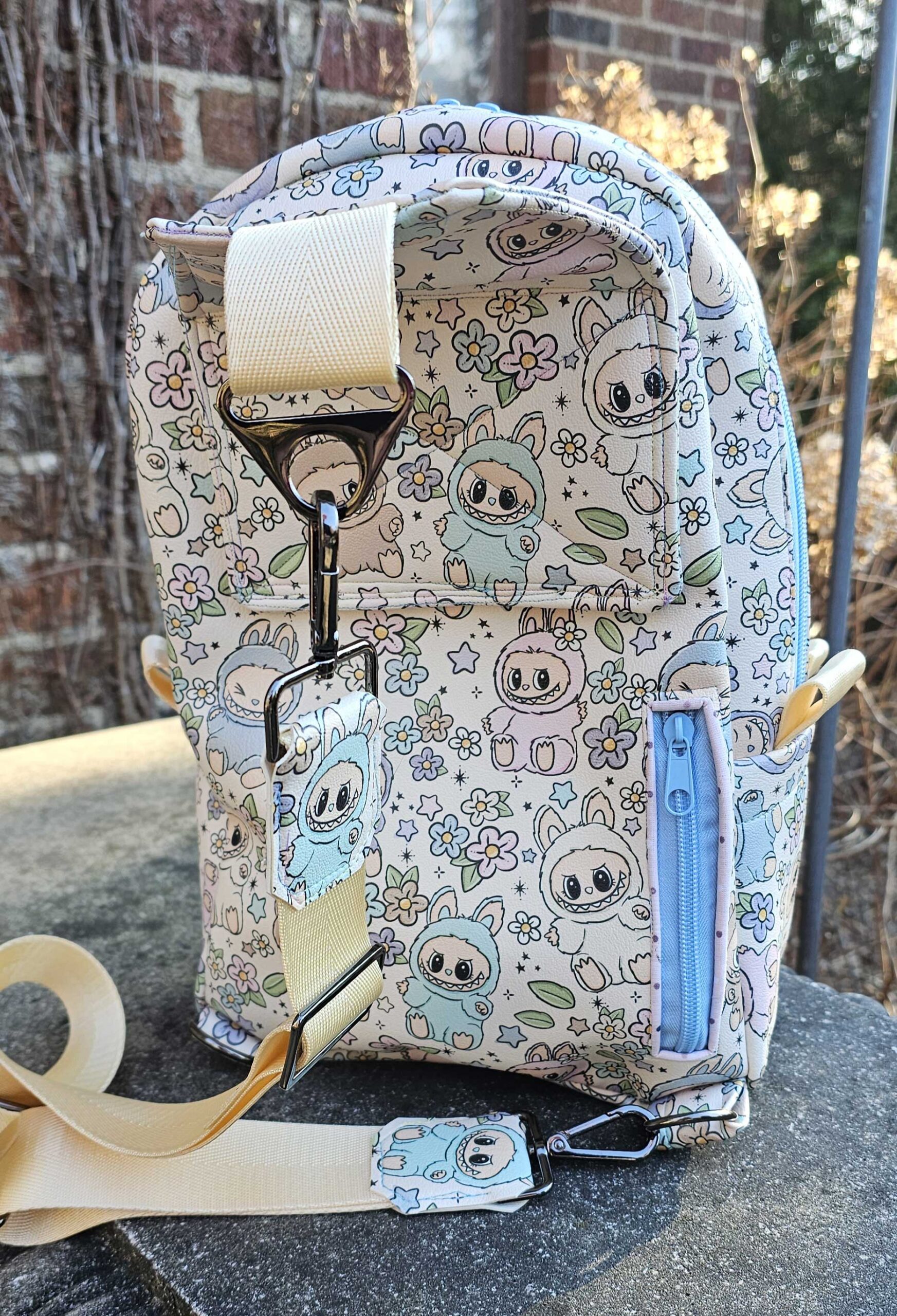 A larger second compartment that can hold as much as a wallet, a water bottle, a lightweight sweater, and a snack for you, OR a couple more Blythes! This compartment is separated from the Blythe compartment with a neoprene liner for moisture resistant padding between your stuff and your doll. Both large compartments have double zippers.