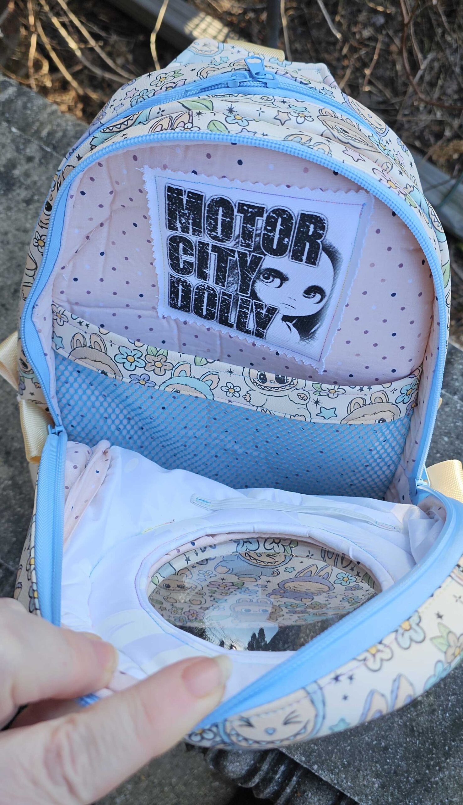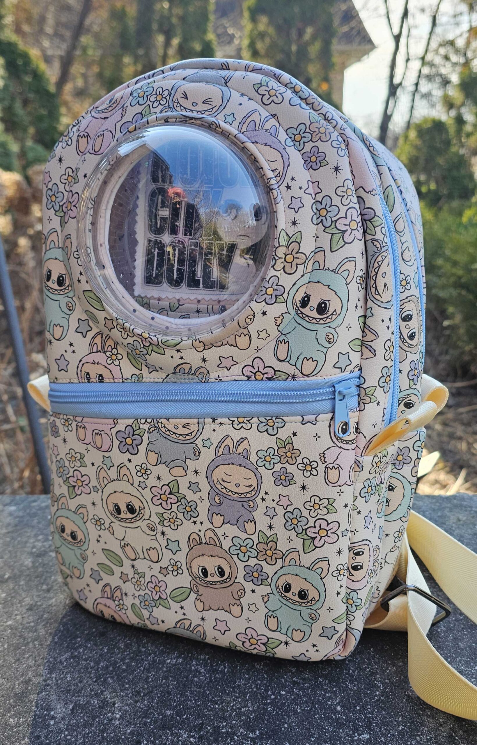 A front compartment just for Blythe and her accessories, with a padded front panel made of white cotton that protects her face, and a sturdy acrylic dome for her to look out on the world. The front compartment features a net pocket to keep posing stands and extra outfits organized, as well as an elastic strap to hold Blythe in place. There is plenty of room for a Faye, Middie or other 8″ doll to snuggle in too!