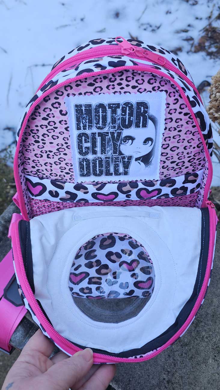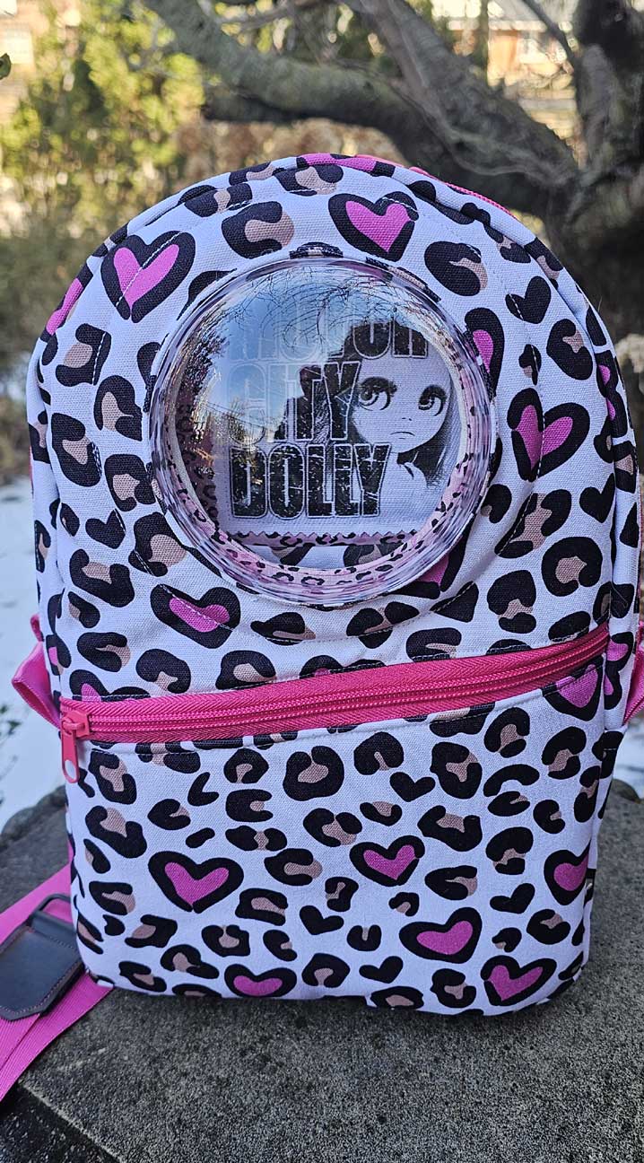 A front compartment just for Blythe and her accessories, with a padded front panel made of white cotton that protects her face, and a sturdy acrylic dome for her to look out on the world. The front compartment features a net pocket to keep posing stands and extra outfits organized, as well as an elastic strap to hold Blythe in place. There is plenty of room for a Faye, Middie or other 8″ doll to snuggle in too!