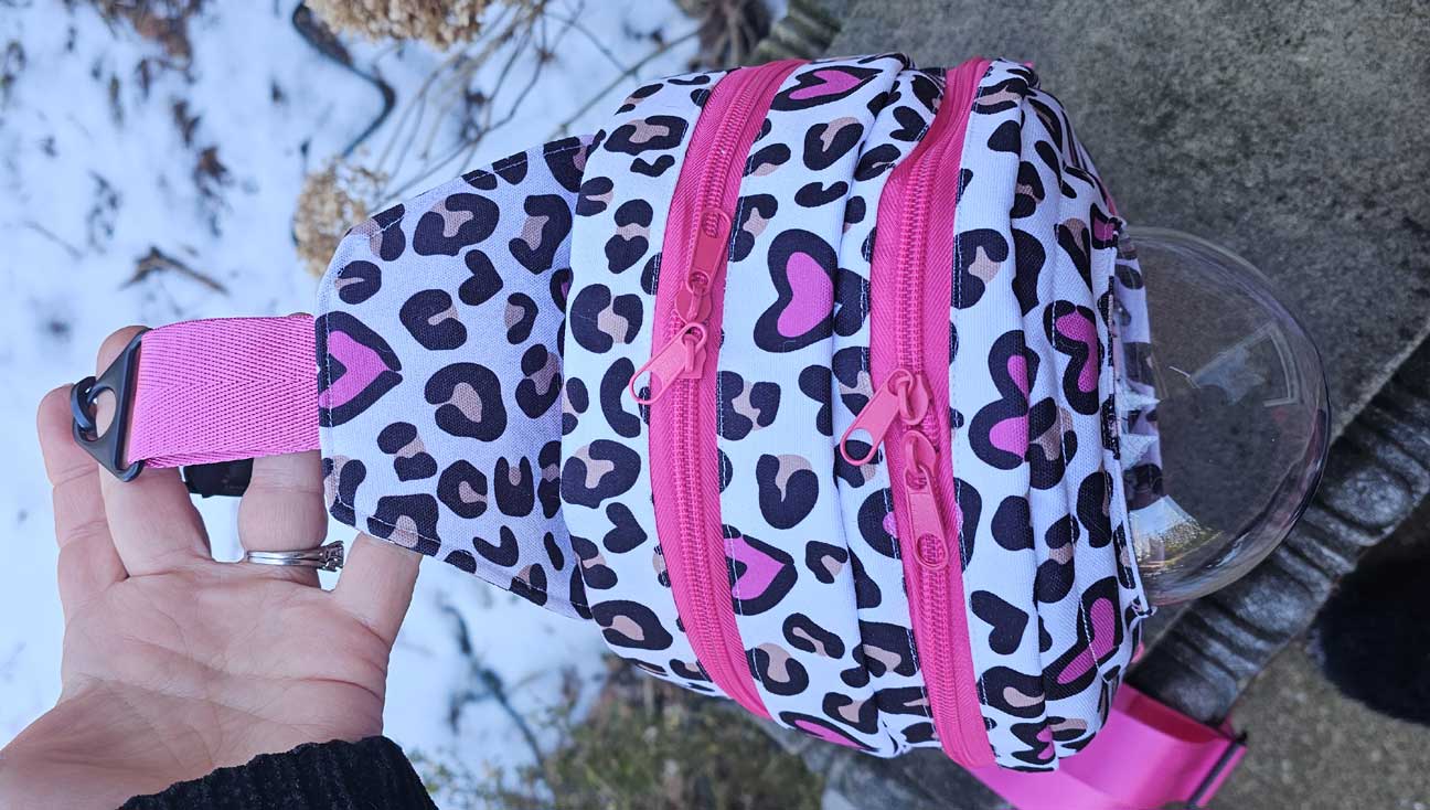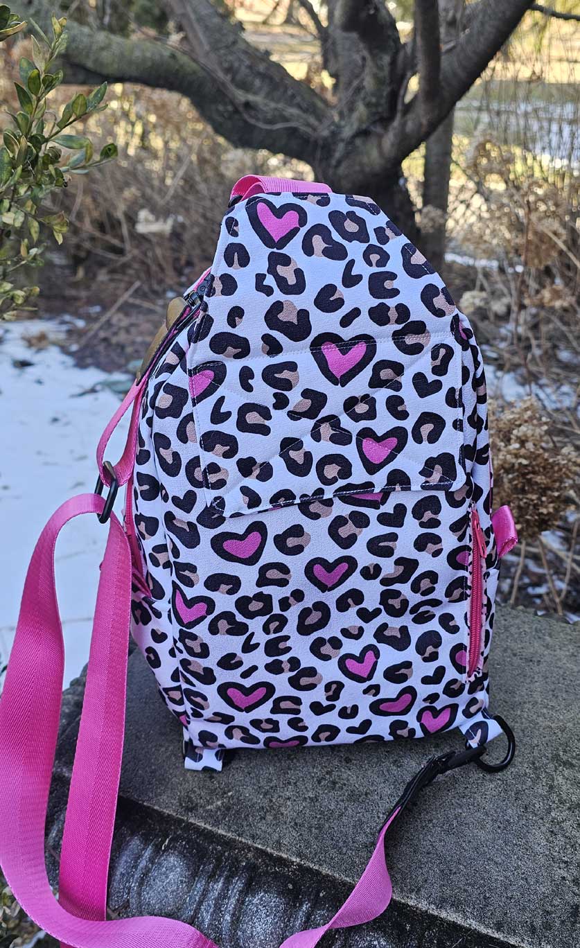 A detachable webbed strap with hardware that allows you to adjust both the length of the strap and the side the bag is carried on, allowing you to easily wear the bag on your front or back, on your right or your left!