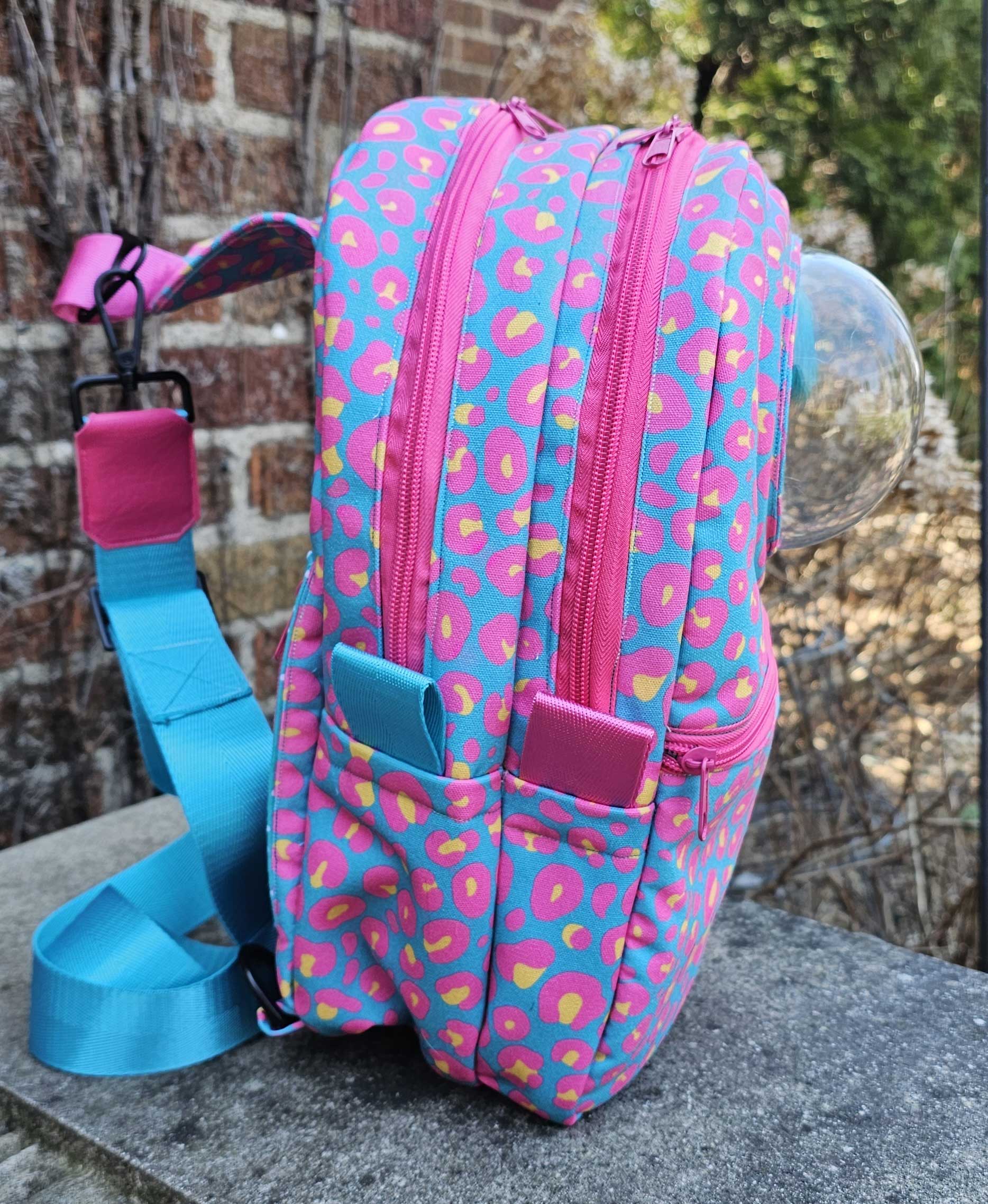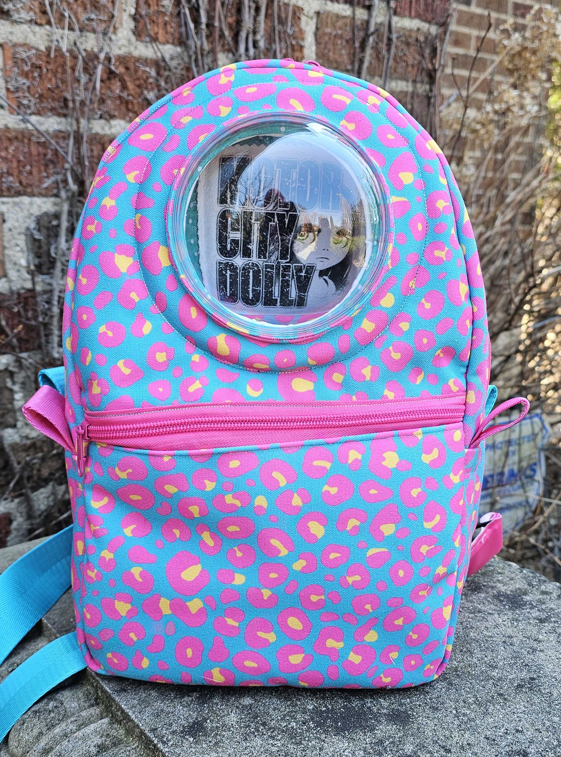 A front compartment just for Blythe and her accessories, with a padded front panel made of white cotton that protects her face, and a sturdy acrylic dome for her to look out on the world. The front compartment features a net pocket to keep posing stands and extra outfits organized, as well as an elastic strap to hold Blythe in place. There is plenty of room for a Faye, Middie or other 8″ doll to snuggle in too!