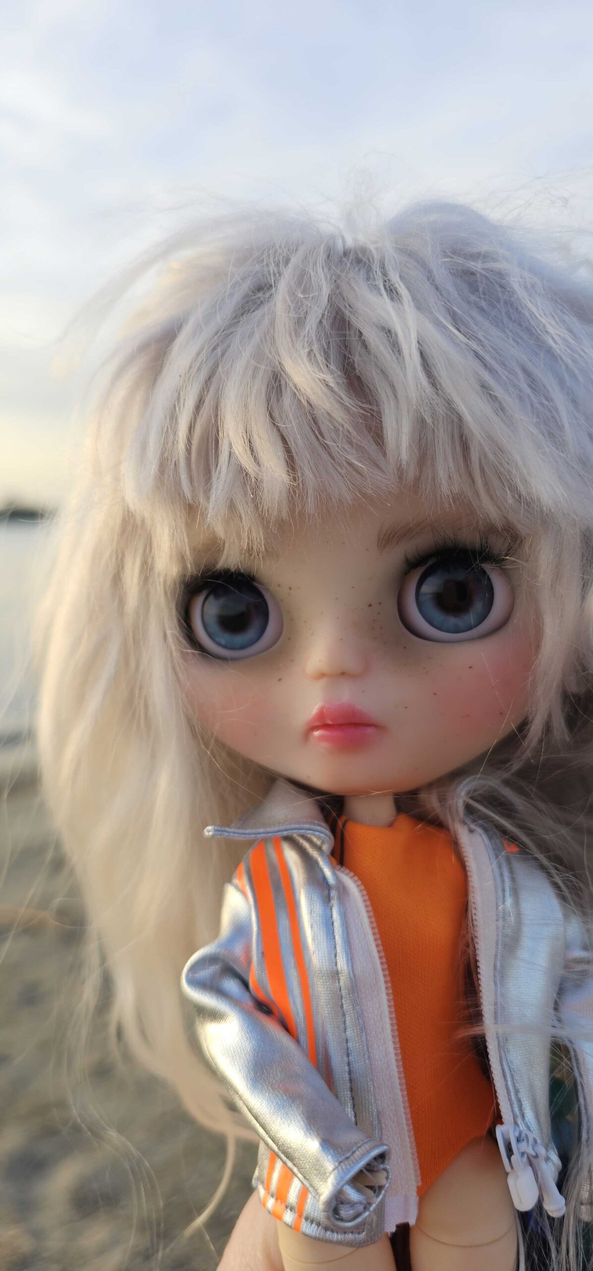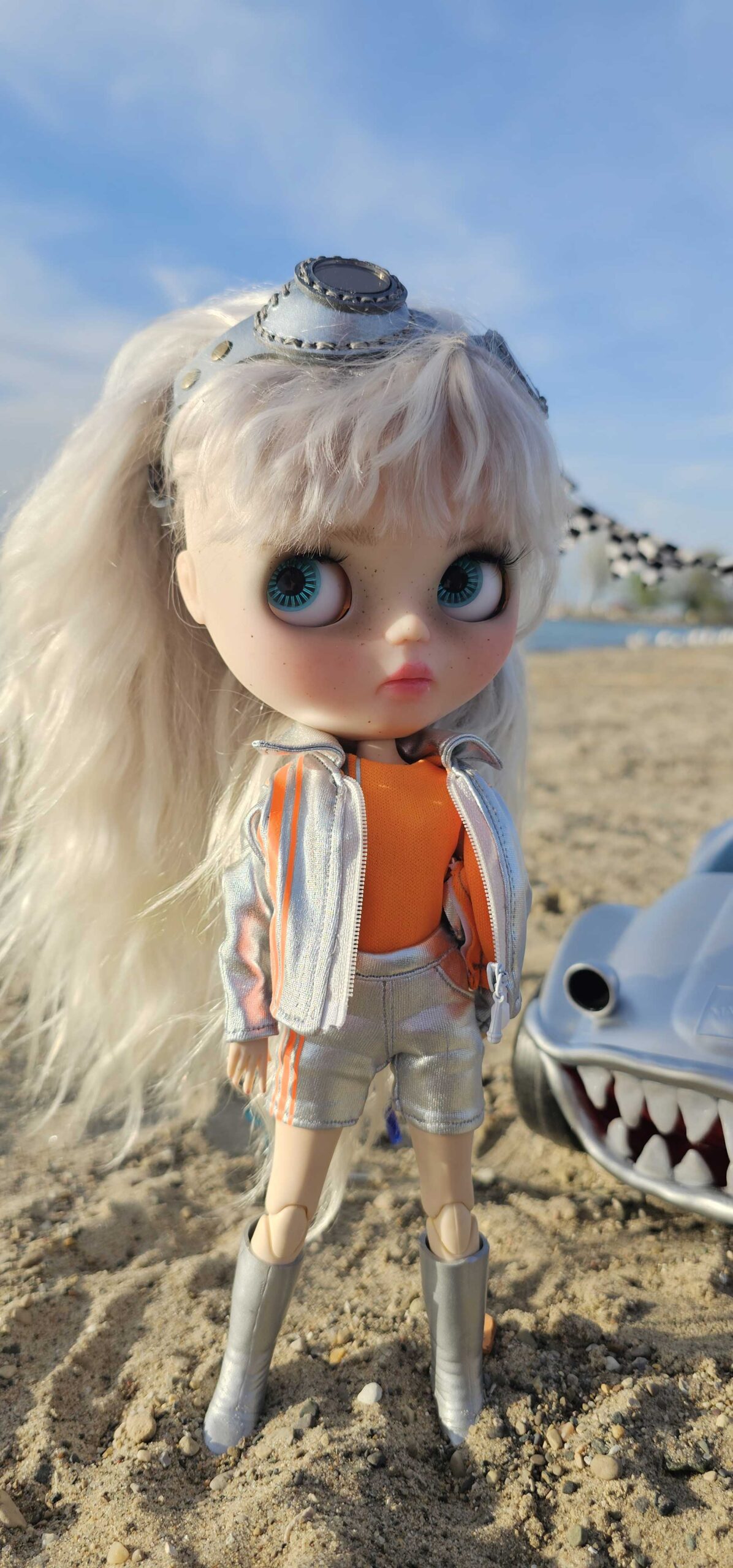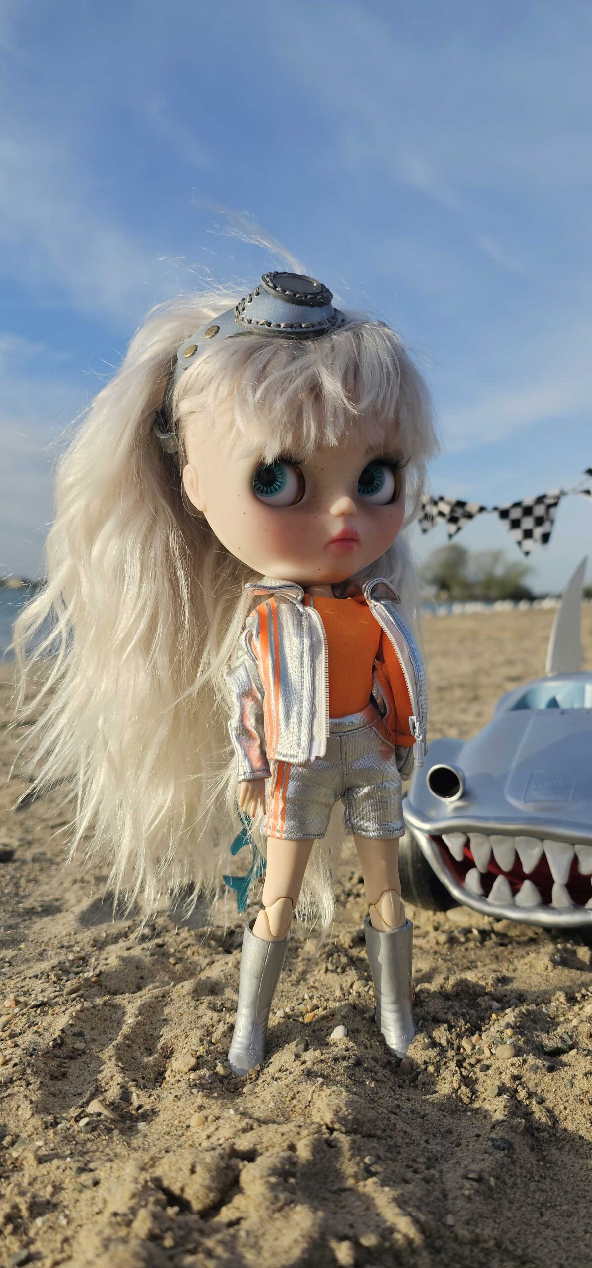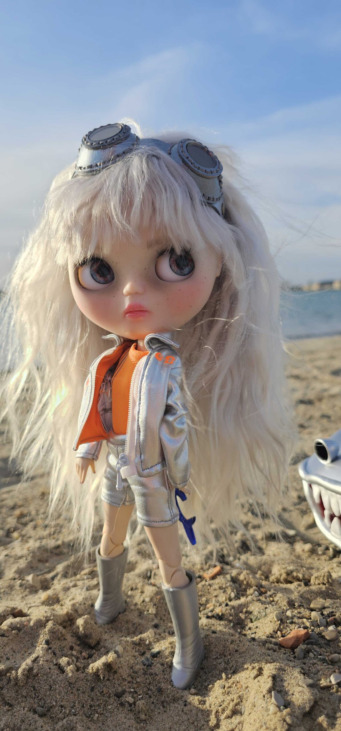 Frankie is a custom Good Smile Company Heavenly Strawberry Blythe doll. She has translucent skin, all new carving and makeup, and a silky soft mohair reroot. She has an open mouth with tiny teeth, 2 pairs of Puppelina eye chips and one pair of my hand painted chips, as well as retaining her special stock blue chips. She is on a YMY 22 body which allows for poseability with stability, which is blushed and sealed. She’ll travel in her complete outfit, including swimsuit, shorts, jacket, and goggles. She will come with the shoes pictured, but they do not actually fit her and these photos were done with her feet removed inside the boot.