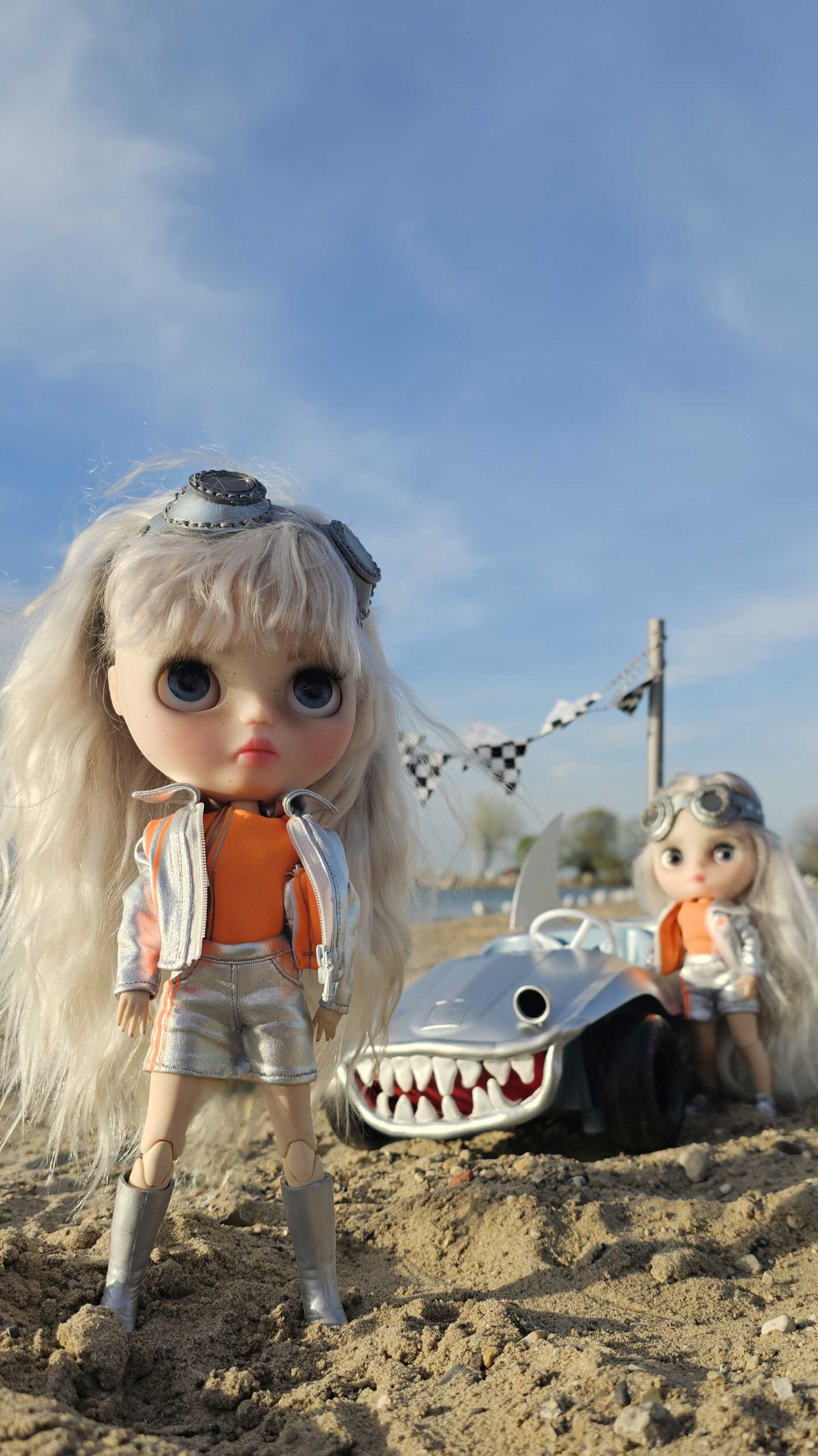 The Motor City Dolly Racing Team.,Frankie & Annette, are beautiful, bold, and deathly competitive. Frankie takes out fellow racers without batting an icy blue eye, while Annette navigates the wide open beach. You’d better be ready to run hard to keep up with these two!