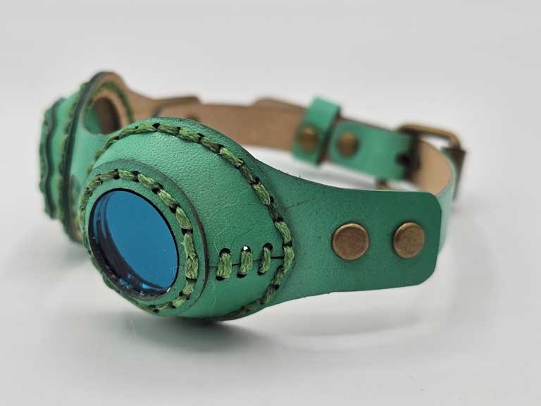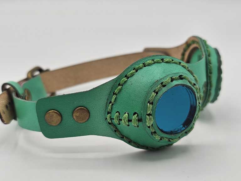 Your adventurous dolly will look super cool in these leather goggles while motorcycling, flying, or being a snow sports star! Each pair is hand dyed and hand stitched from genuine leather, with brass hardware and acrylic lenses. A buckle allows them to easily be adjusted to fit over hats or varying hair thickness.