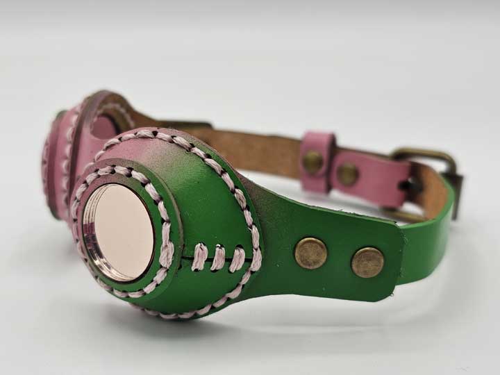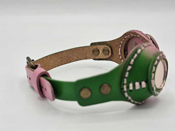 Your adventurous dolly will look super cool in these leather goggles while motorcycling, flying, or being a snow sports star!  Each pair is hand dyed and hand stitched from genuine leather, with brass hardware and acrylic lenses.  A buckle allows them to easily be adjusted to fit over hats or varying hair thickness.