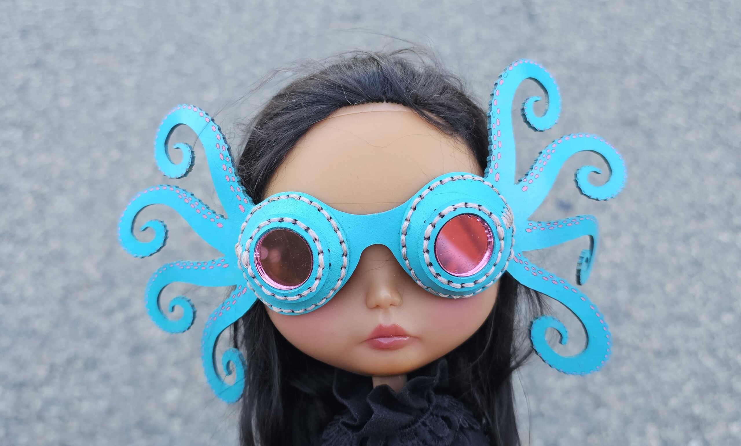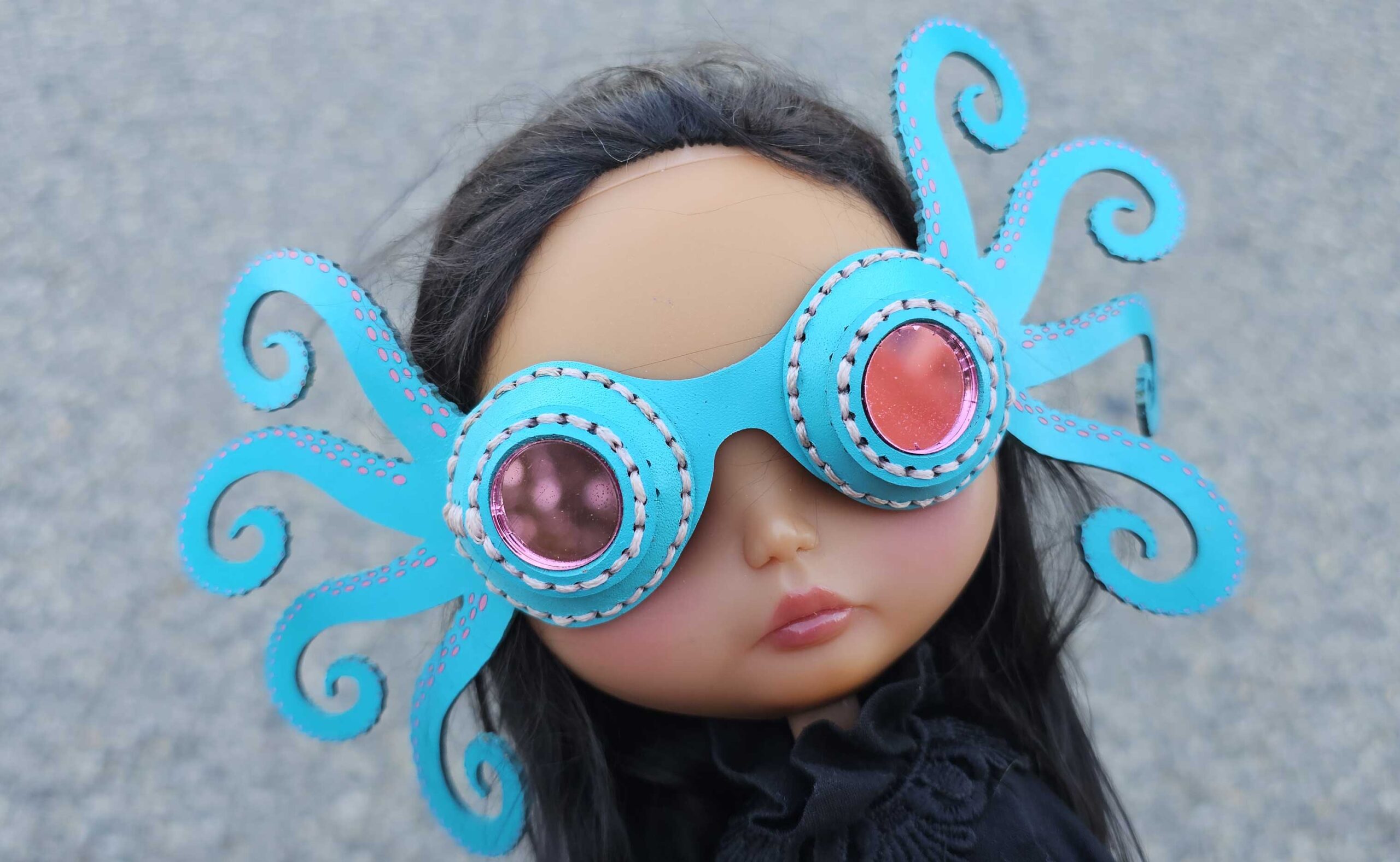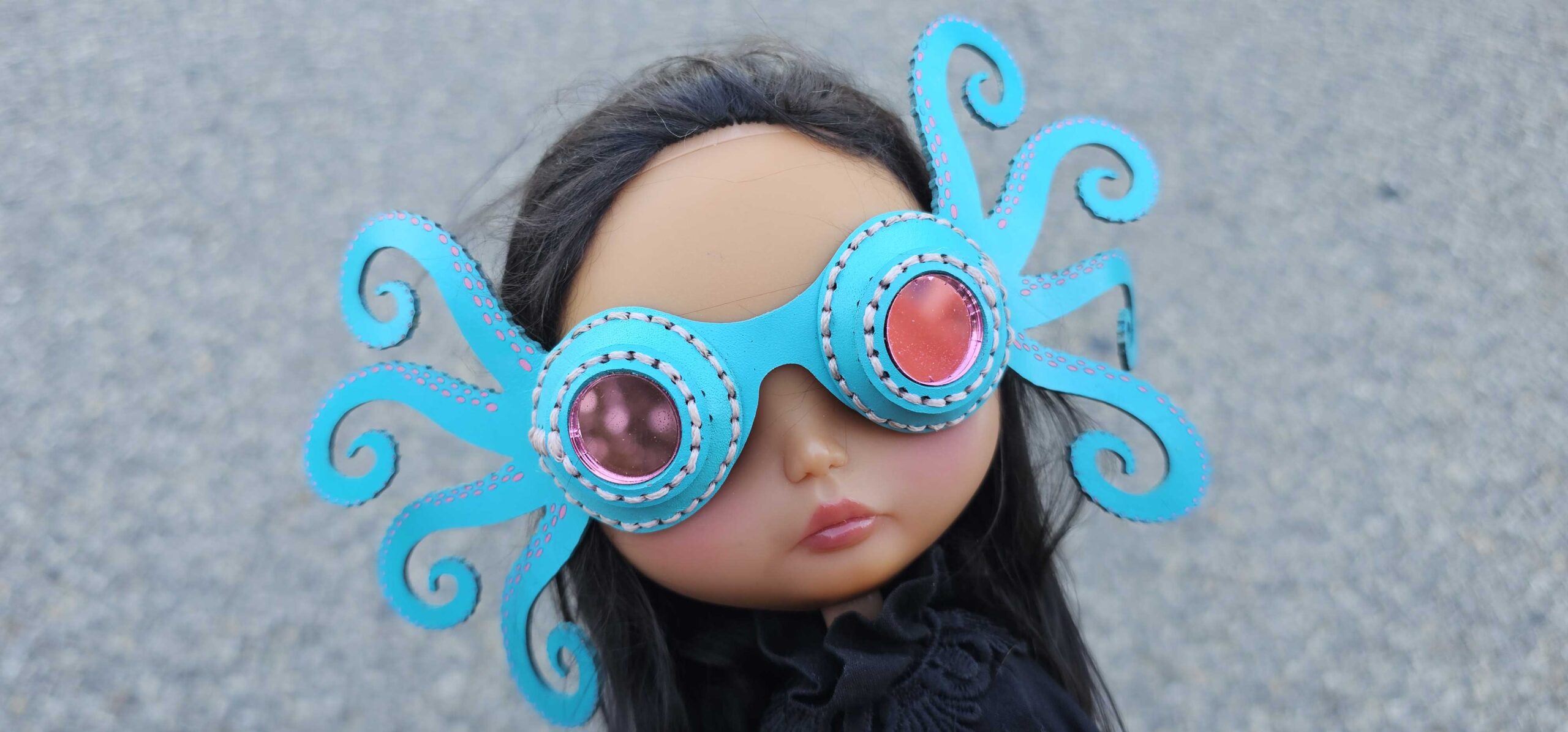 Your adventurous dolly will look super cool in these leather goggles while motorcycling, flying, or being a snow sports star! Each pair is hand dyed and hand stitched from genuine leather, with brass hardware and acrylic lenses. A buckle allows them to easily be adjusted to fit over hats or varying hair thickness.
